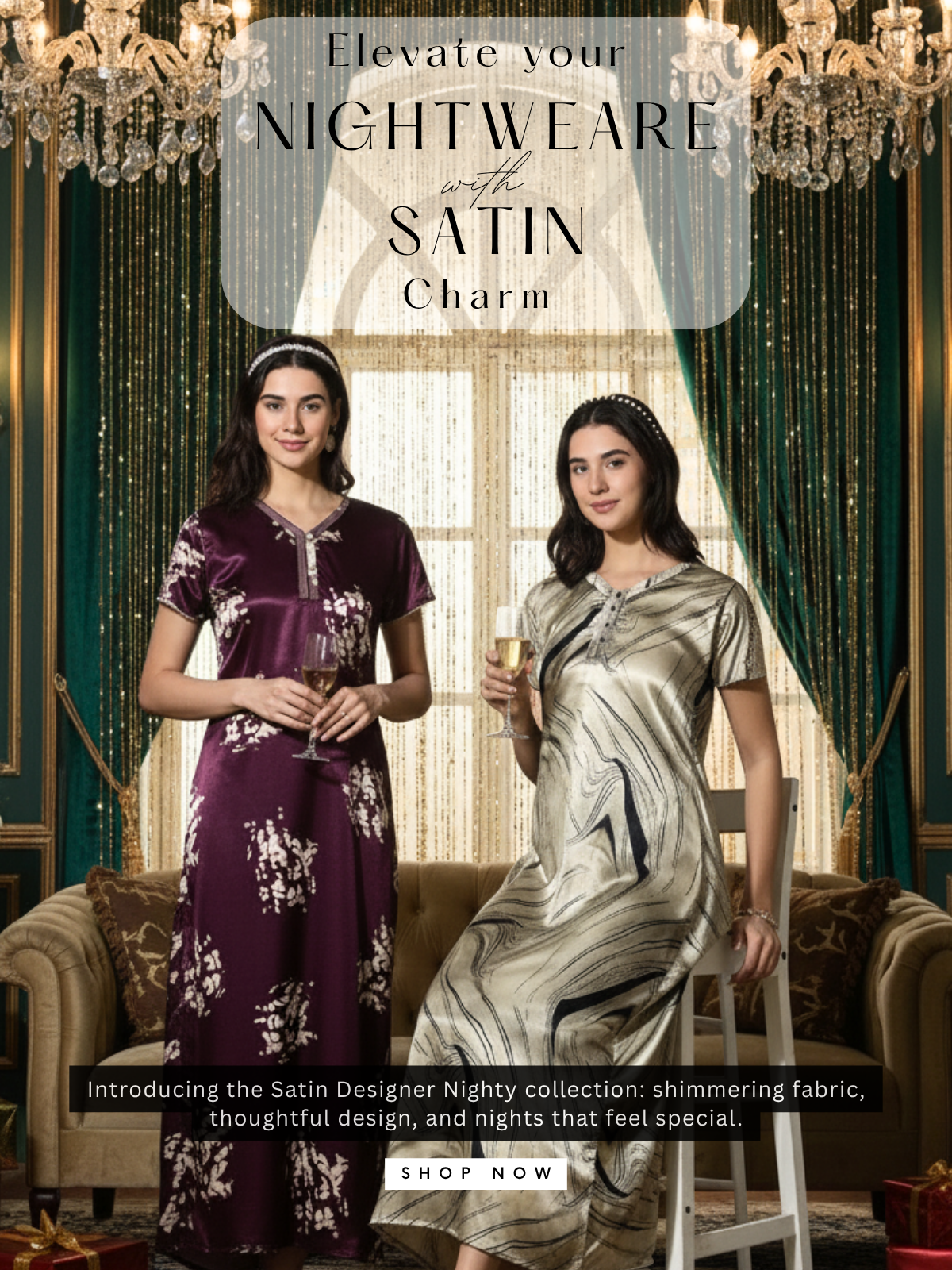 Delicate, dreamy, and divine — the Powder Pink Satin Nightdress brings an aura of feminine grace to your nightly unwind. The silky satin fabric glows with a soft blush sheen, while dainty floral prints add a touch of poetic charm. Designed for those who adore light pastel elegance, it’s an instant mood-uplifter after a long day.