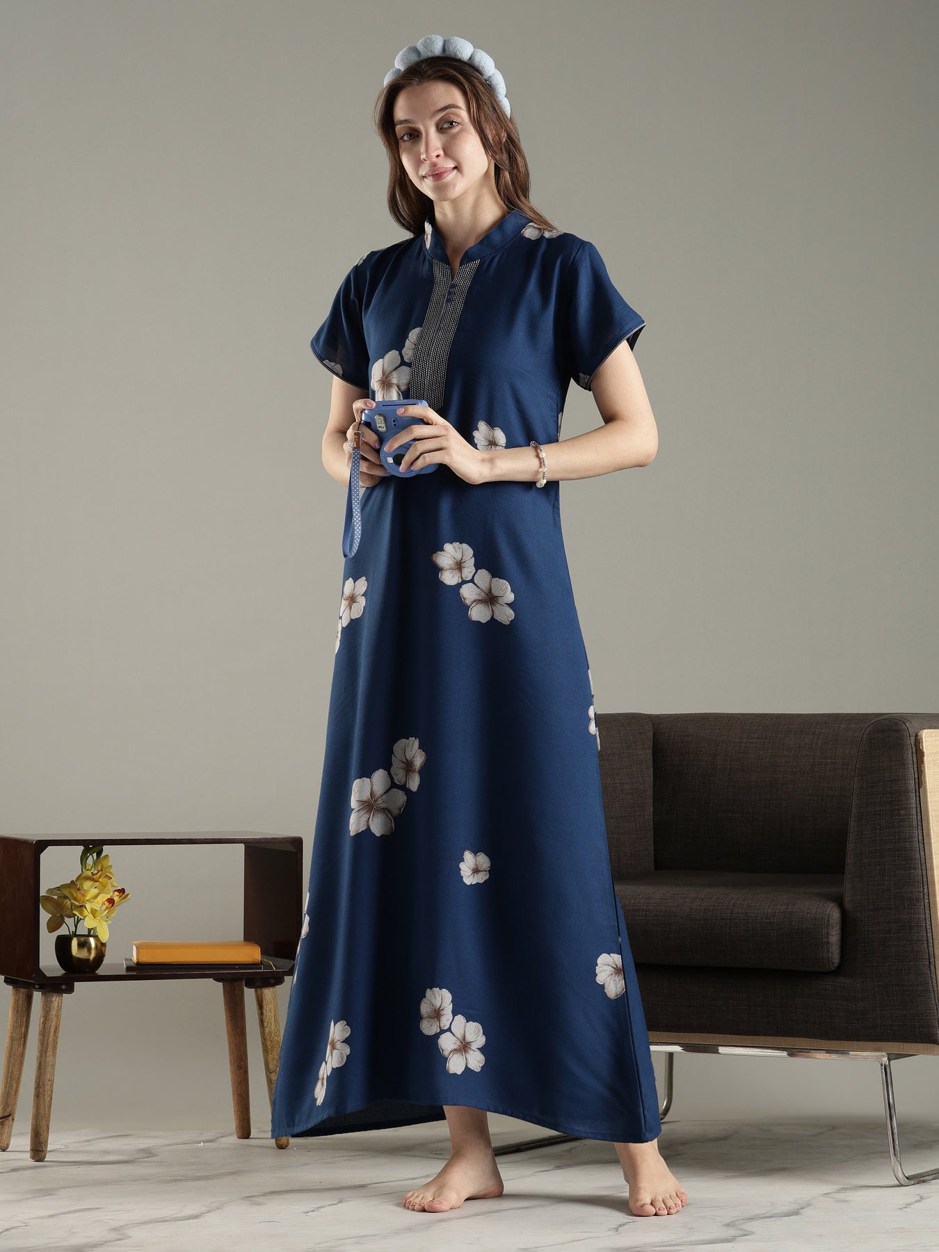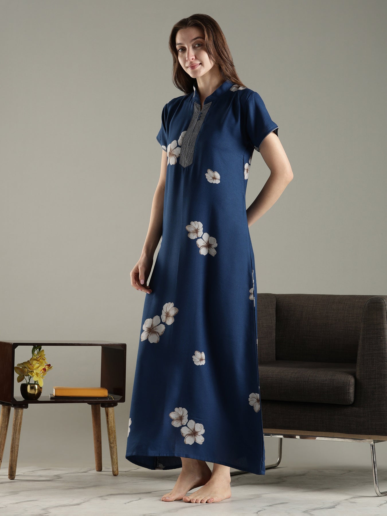 The Twilight Azure Alpine Designer Nighty brings together calming tones and effortless comfort. Set against a deep blue base, the traditional floral print adds softness and visual balance. Designed with an A-line silhouette, this nightdress offers ease of movement while maintaining a graceful fall.