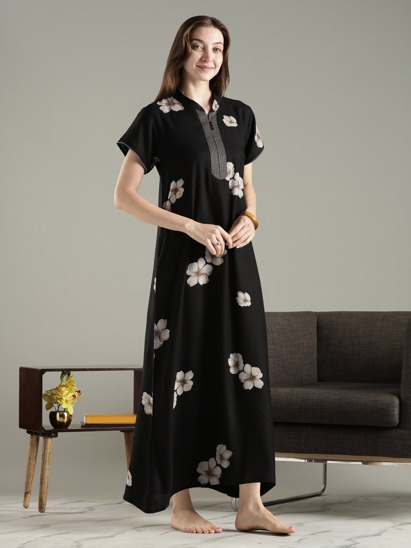 Experience timeless comfort with this Alpine A Line Designer Nighty in Twilight Noir. Designed with a flowing silhouette and traditional floral print, this nightdress blends classic charm with everyday ease. The deep black base enhances the soft floral motifs, making it a refined choice for nightly wear and relaxed lounging.