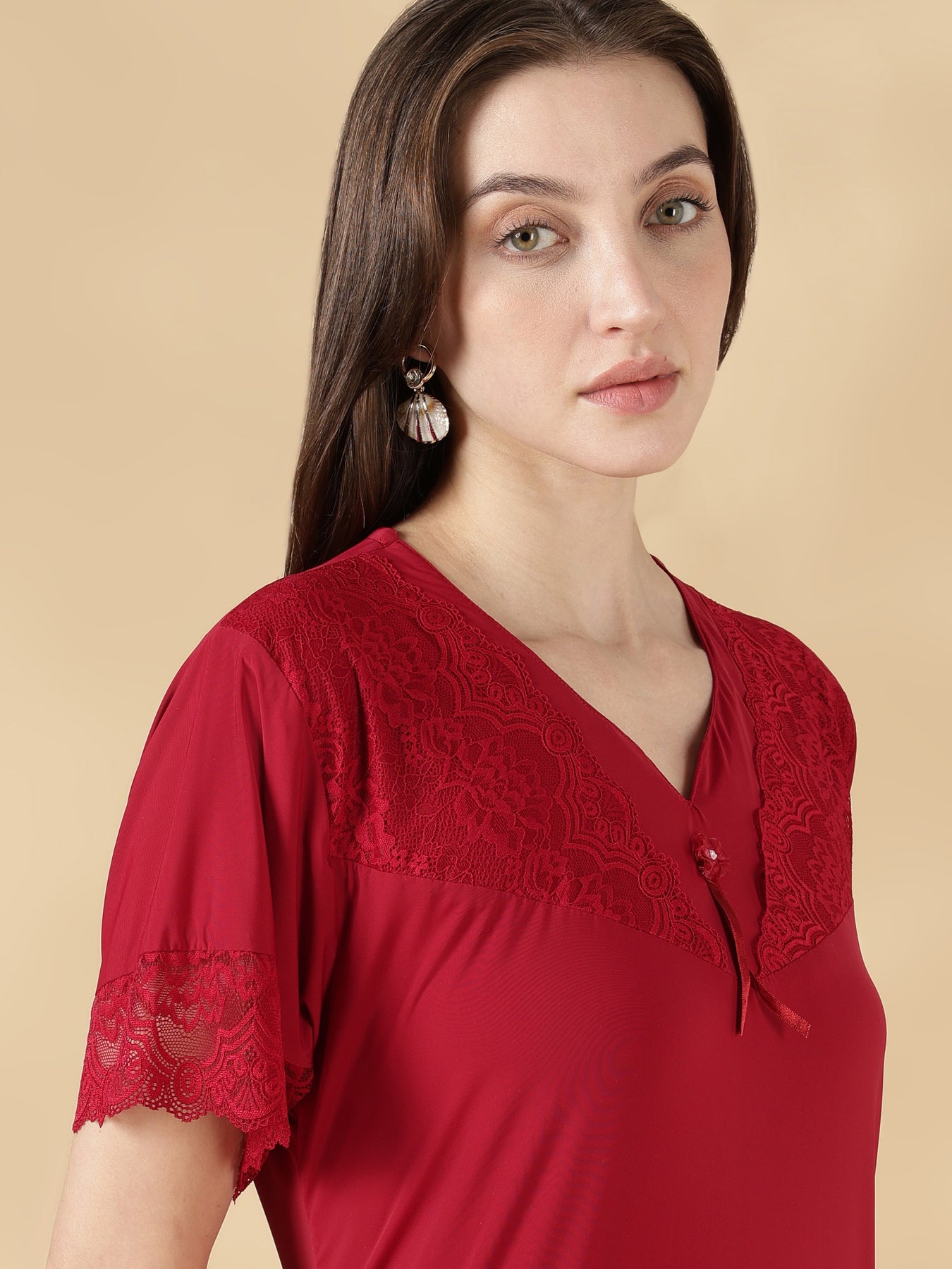 Experience calm luxury every night with this Designer Nighty in Red Bloom. Crafted in a smooth mulberry-tone malai, this A-line nighty drapes beautifully while offering a relaxed and flattering silhouette. The premium lace yoke paired with a soft V-notch neckline adds a delicate, feminine finish, making it ideal for evening relaxation and restful sleep.