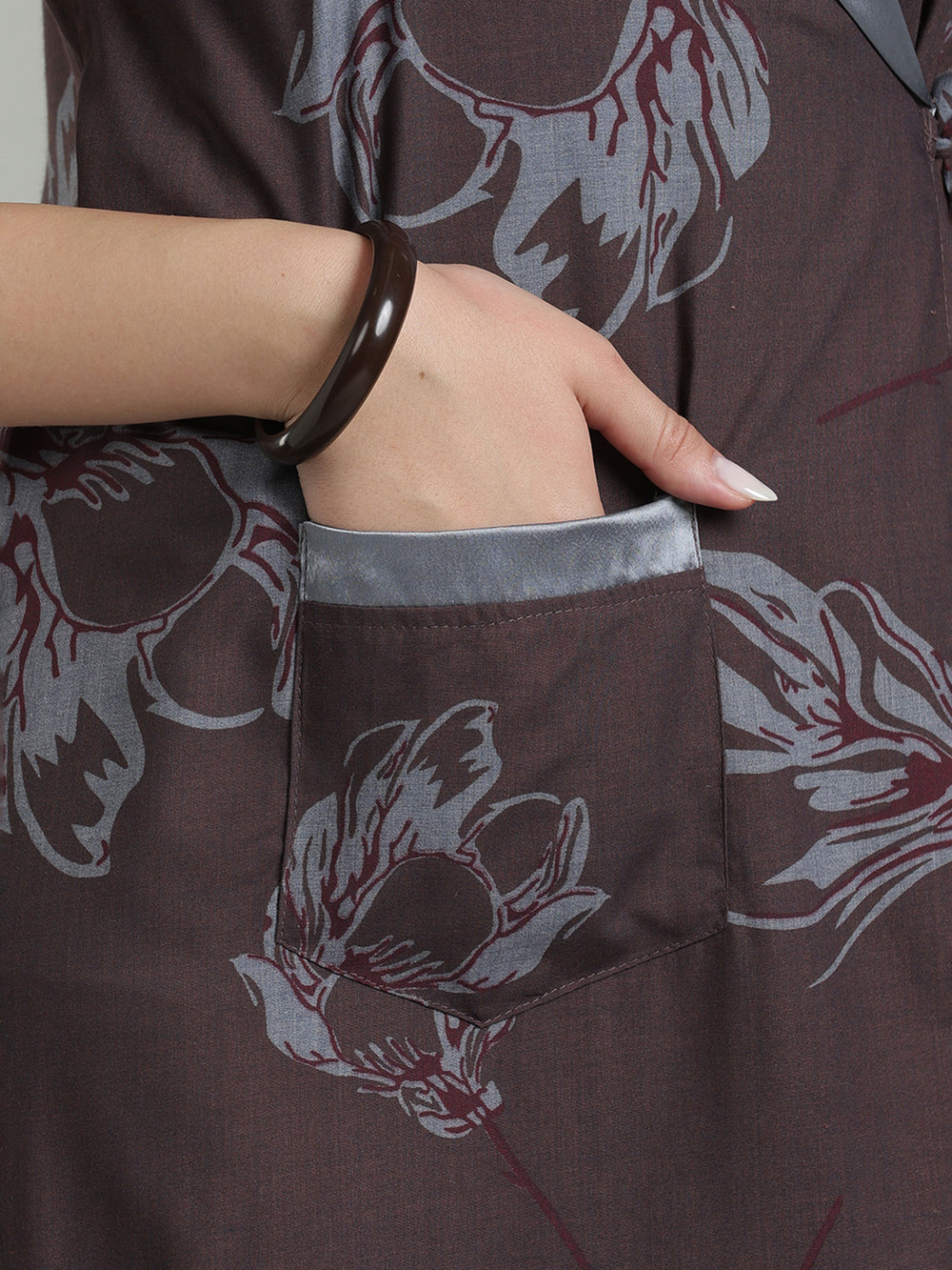 Functional Features: Designed with practicality in mind, this nightgown includes a convenient pocket on the right side, ideal for keeping small essentials close at hand. The floor-length, A-line silhouette ensures a flattering fit for all body types.