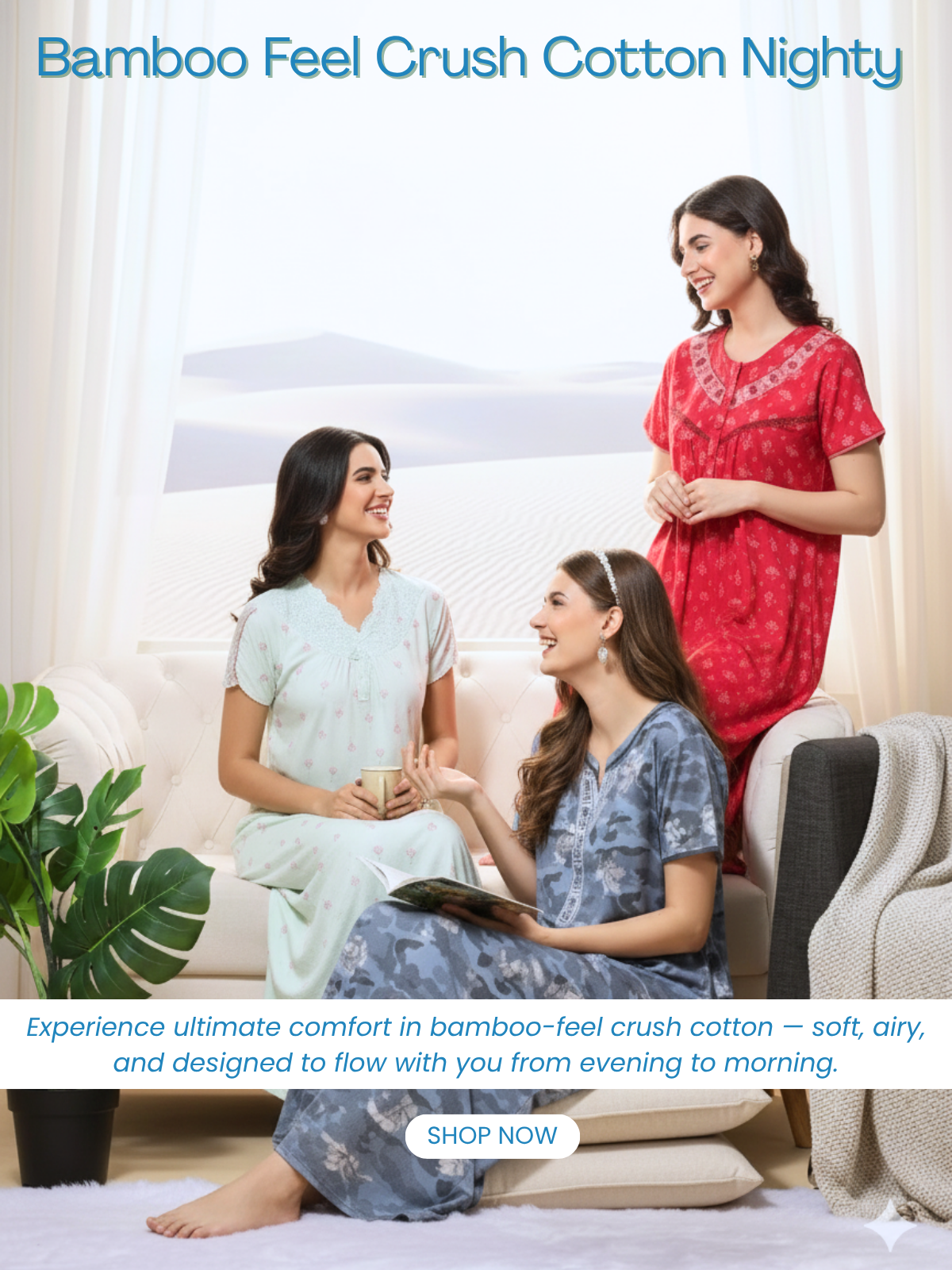 Made from 100% breathable cotton, these pure cotton nighties are a timeless favorite. Designed with floral prints, easy silhouettes, and soft textures, they’re ideal for everyday lounging and sleep in warm weather.