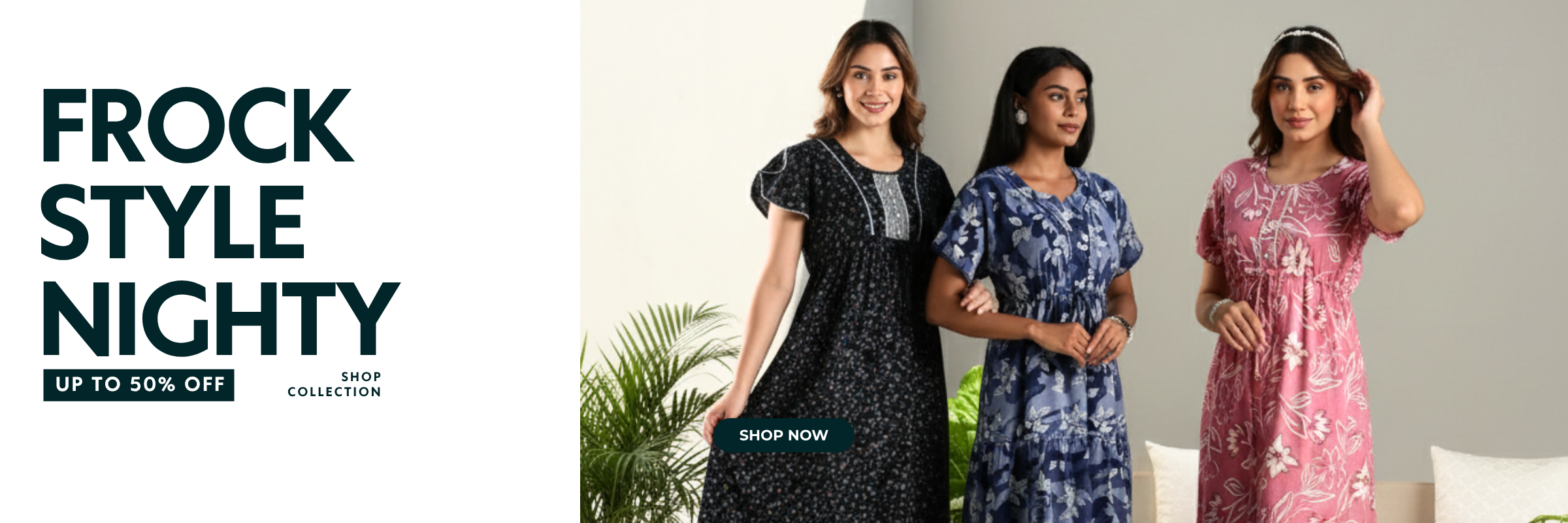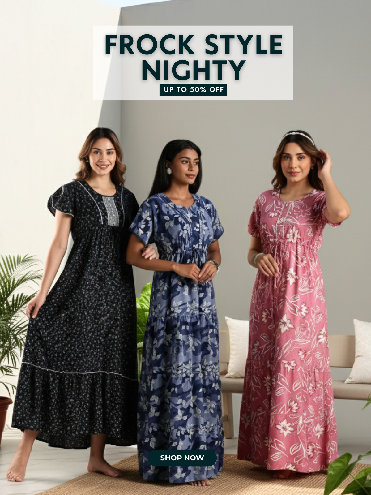 Frock type nighties are crafted from premium fabrics like rayon, alpine blends, and viscose, offering breathability, softness, and durability for lasting comfort. Designed with intricate embroidery, vibrant prints, and stylish silhouettes, these elegant nightgowns for women are perfect for lounging, sleeping, or casual outings. Thoughtful details such as drawstrings for a tailored fit, functional side pockets, and adjustable waistbands provide practicality without compromising style. For those who love flowy and versatile designs, explore our kaftan nighties, which blend elegance with comfort effortlessly. With a versatile appeal that enhances your wardrobe, our frock-style nightgowns cater to various occasions and are available in a wide range of sizes, including plus sizes, ensuring a perfect fit for every body type.