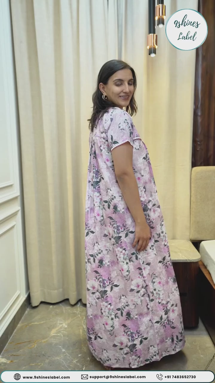 Pure Cotton Mauve Floral Chikankari Nighty with Pleated Fit