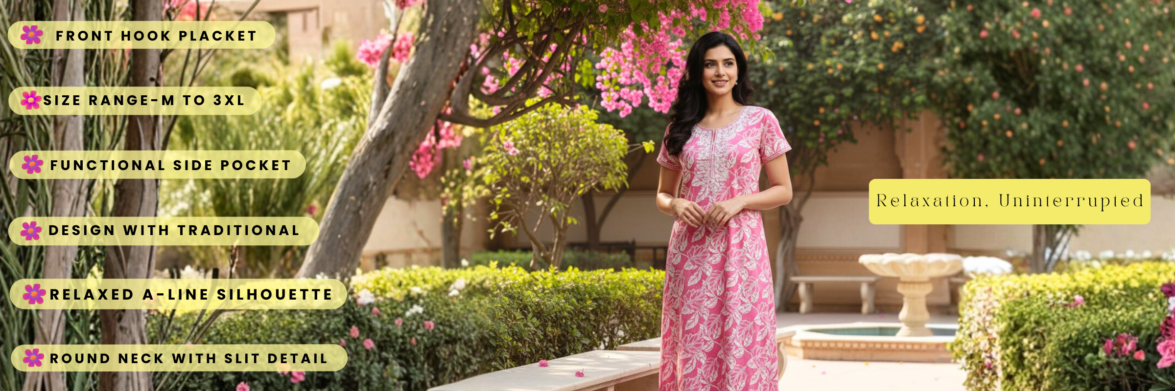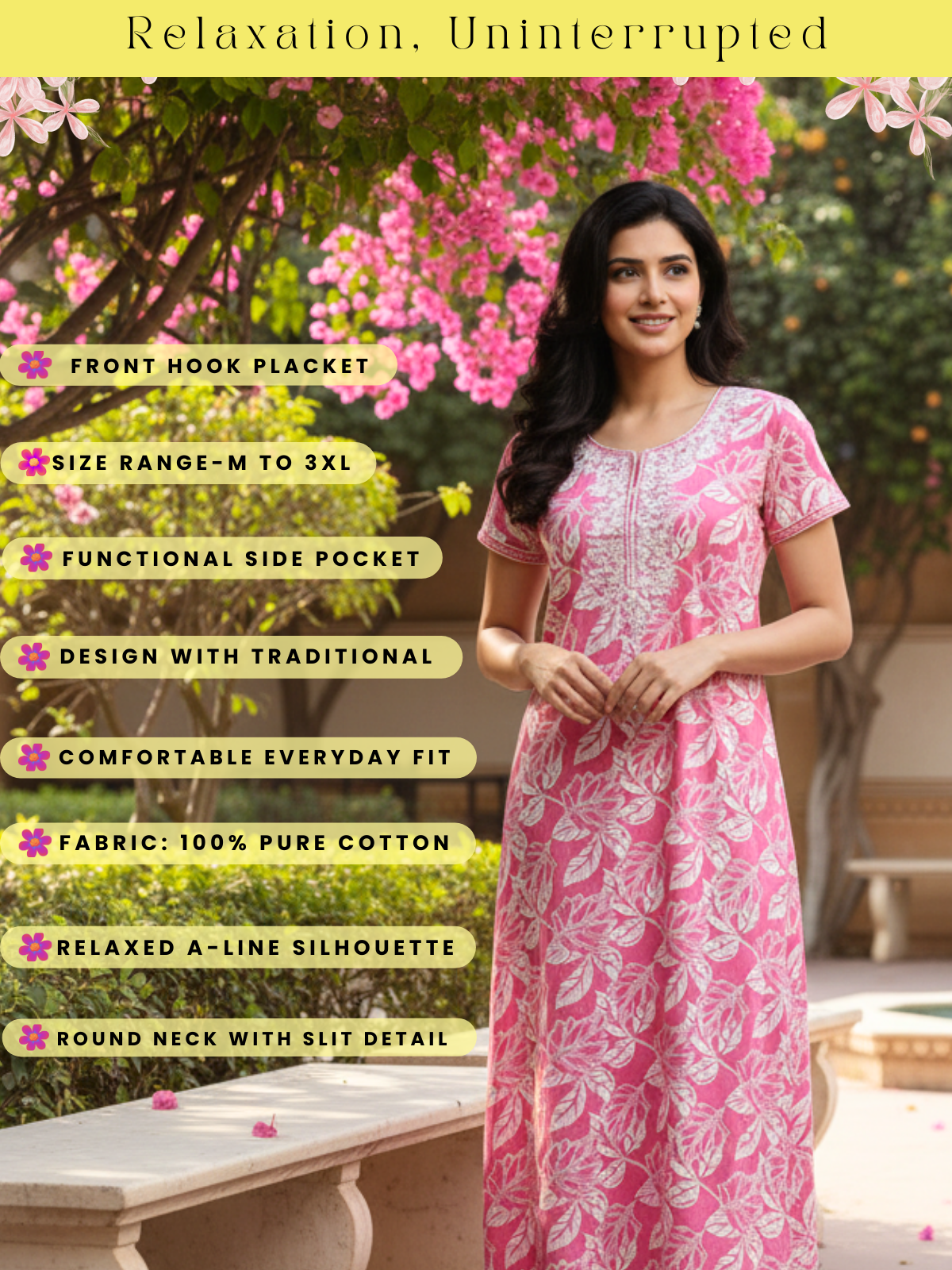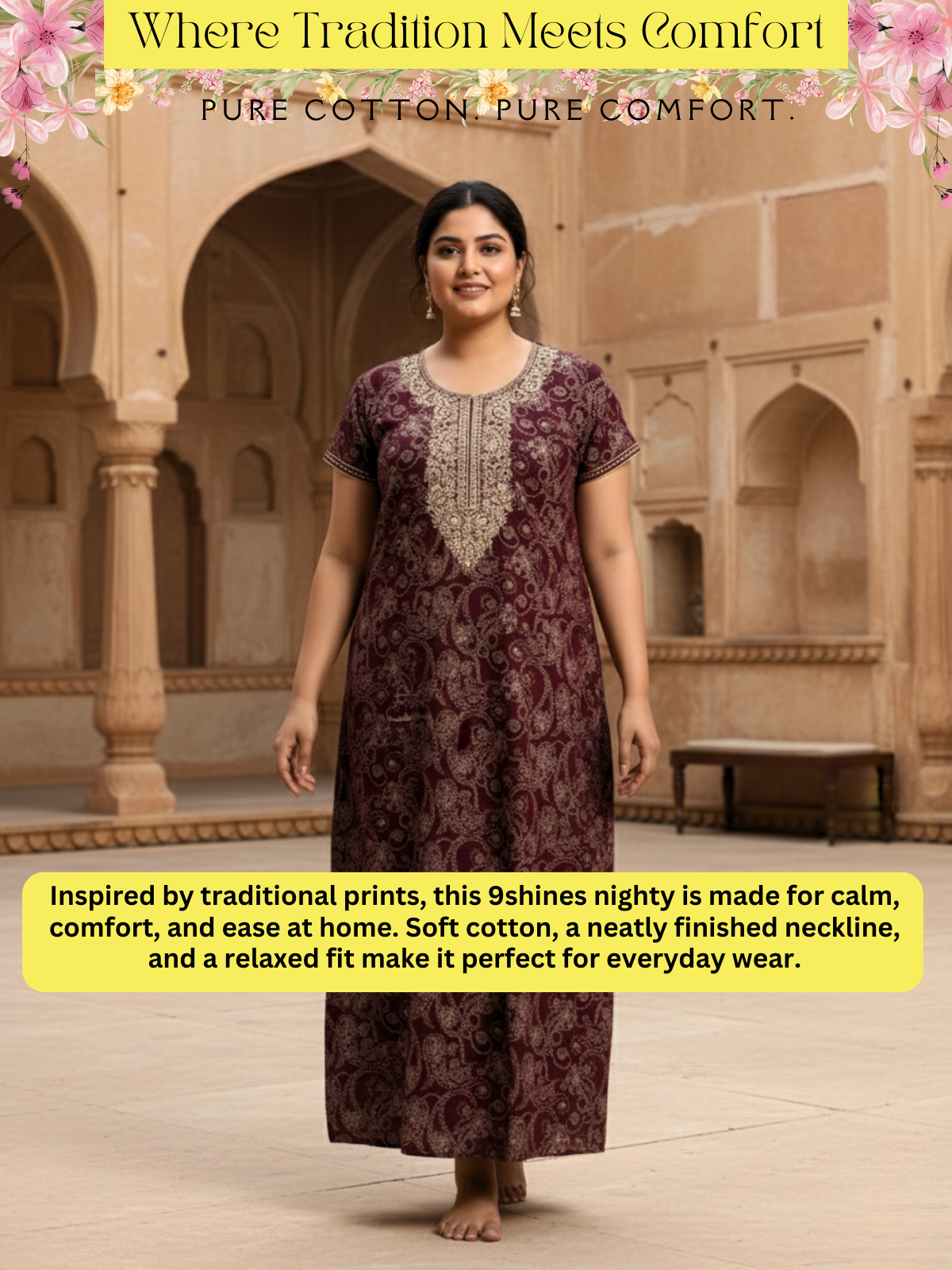 Admired for its luxurious hue, intricate embroidery, and soft cotton comfort, this nighty for women brings festive energy and royal elegance to your wardrobe. Indulge in breathable comfort and timeless Indian craftsmanship with this Dark Purple Jaipuri Embroidered Cotton Nighty, designed to blend elegance, softness, and effortless style.