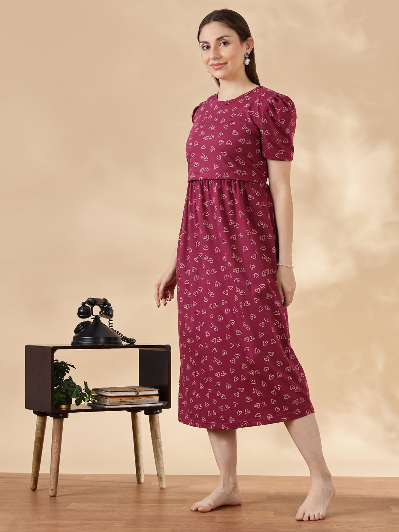 Berry Plum Hearts Maternity Nighty for Women Feeding Friendly