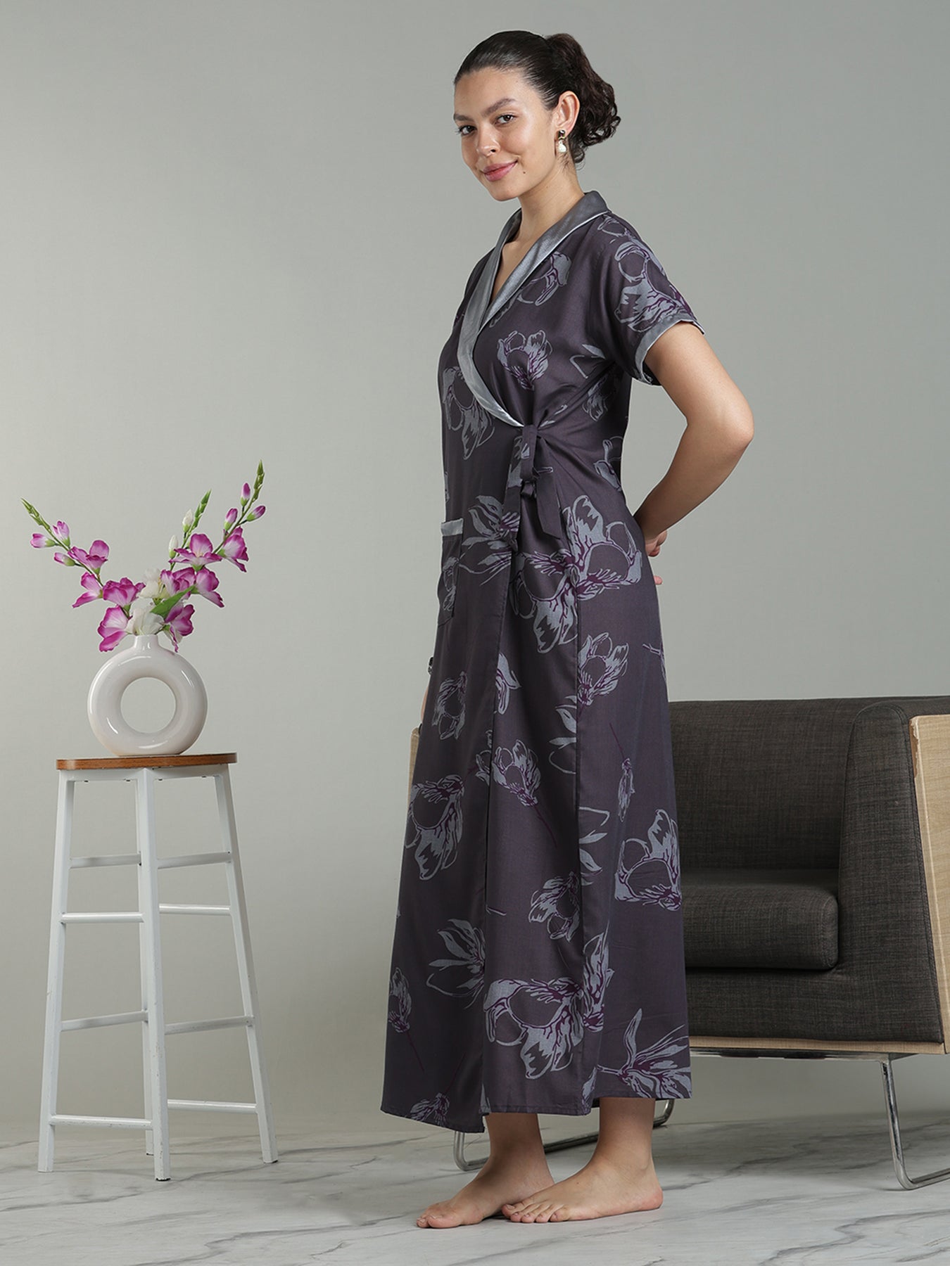 Wrap yourself in the luxurious Plum Mist Viscose Blend Ladies Housecoat, designed to elevate everyday lounging. The rich plum tone paired with a delicate floral sketch print creates a calm yet stylish look for home wear. Made from a breathable viscose-polyester blend, this housecoat feels soft on the skin and comfortable for long hours. The thoughtfully designed double-knot wrap system with one inner tie and one outer tie ensures the robe stays securely in place without shifting, while the contrast V-neck and practical pockets add a flattering, functional finish.