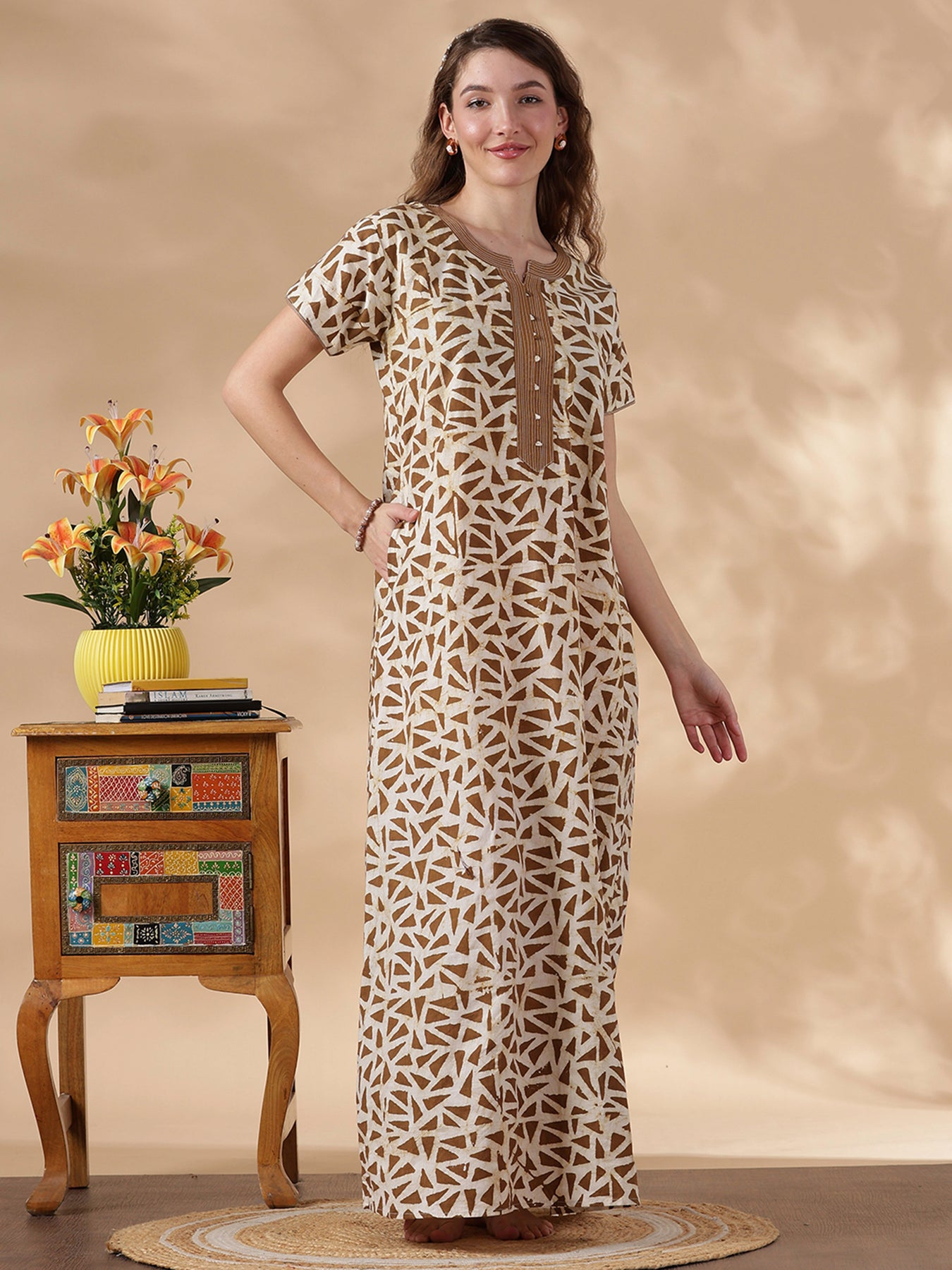 This pure cotton nighty brings together Rajasthan's traditional batik craftsmanship and everyday comfort. The warm brown and cream geometric patterns are created using authentic wax-resist dyeing, while gold-toned neckline details add a touch of elegance.
