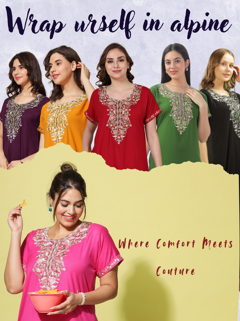 Luxurious Comfort: Experience unparalleled softness and breathability with our Alpine Designer Nighty, crafted from a premium blend of 12% cotton, 37% rayon, and 51% polyester. The lightweight and wrinkle-free fabric makes it perfect for all-season wear, offering both comfort and durability.