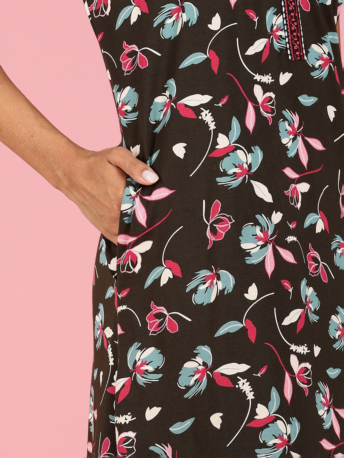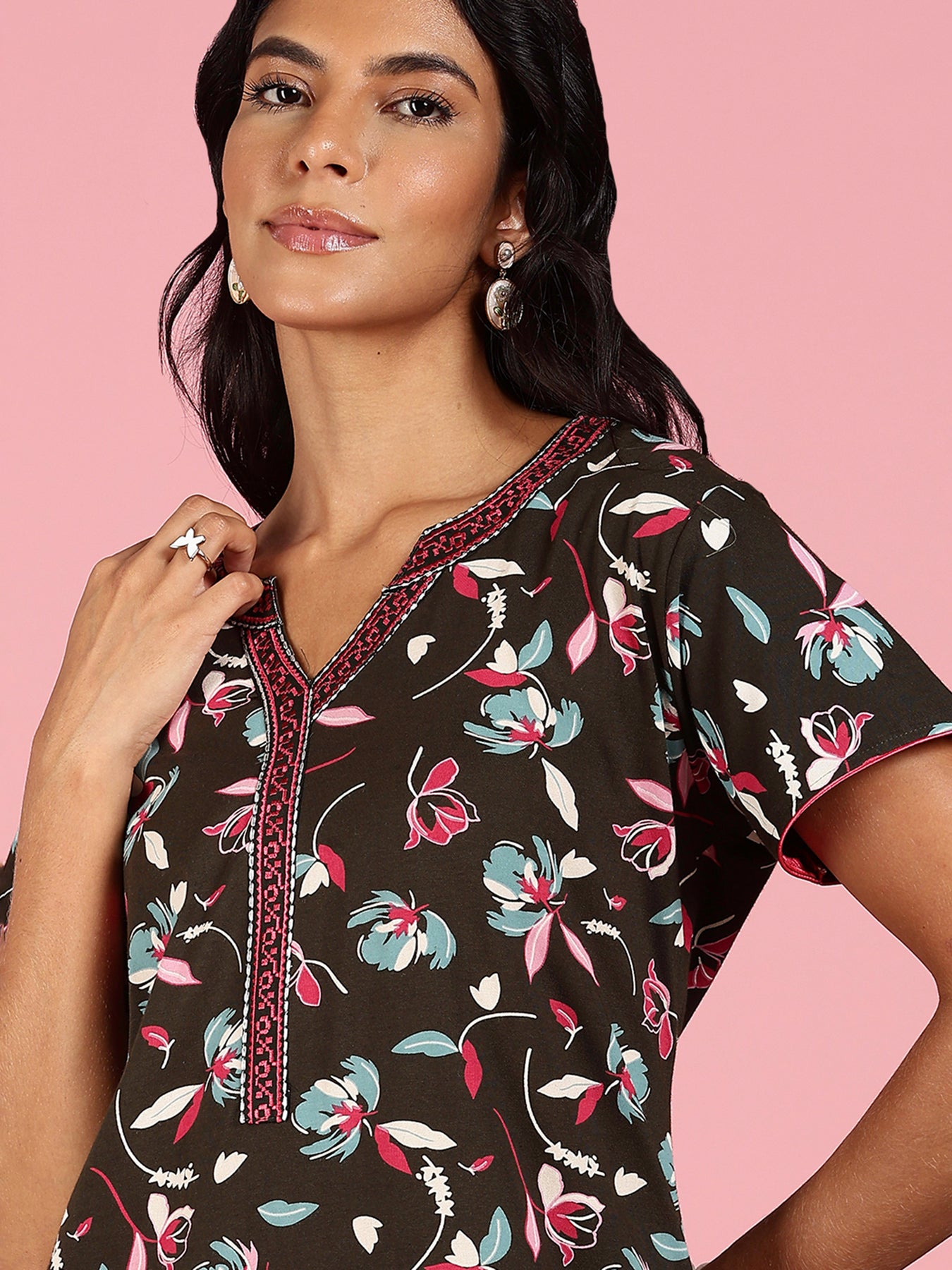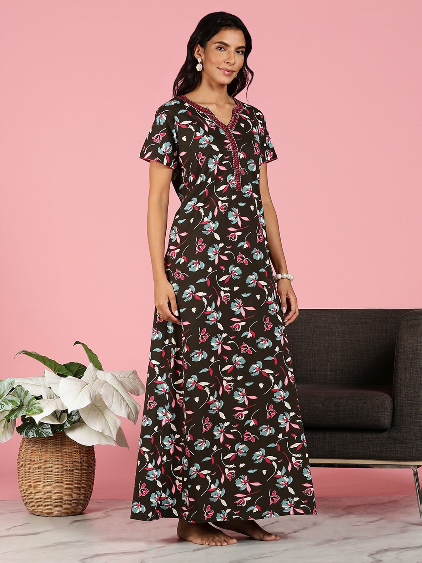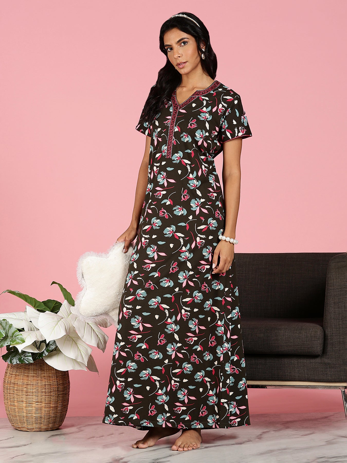 Deep Maroon Hosiery Cotton Floral Nightdress with Embroidered Neckline