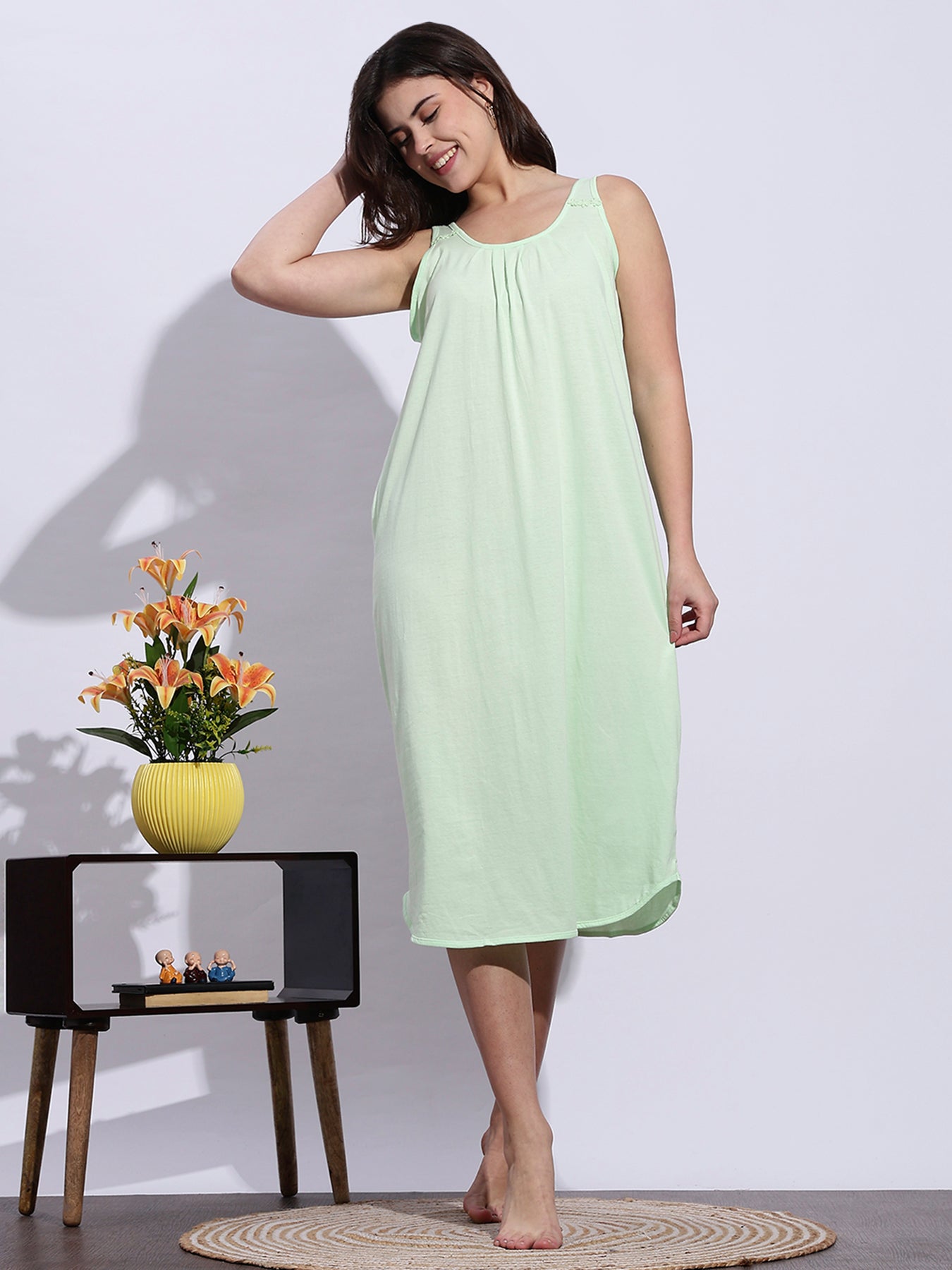 Mint Green Sleeveless A Line Cotton Hosiery Nighty Slip for Women
