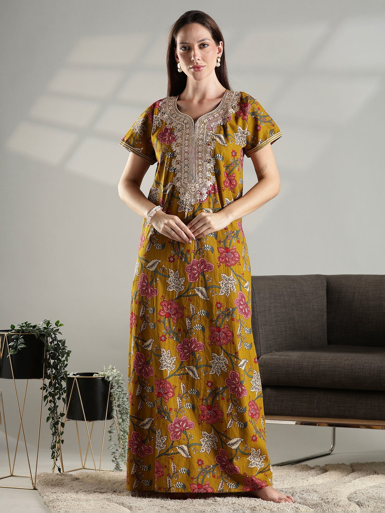 Mustard Floral Cotton Nighty for Women Soft Breathable Fit