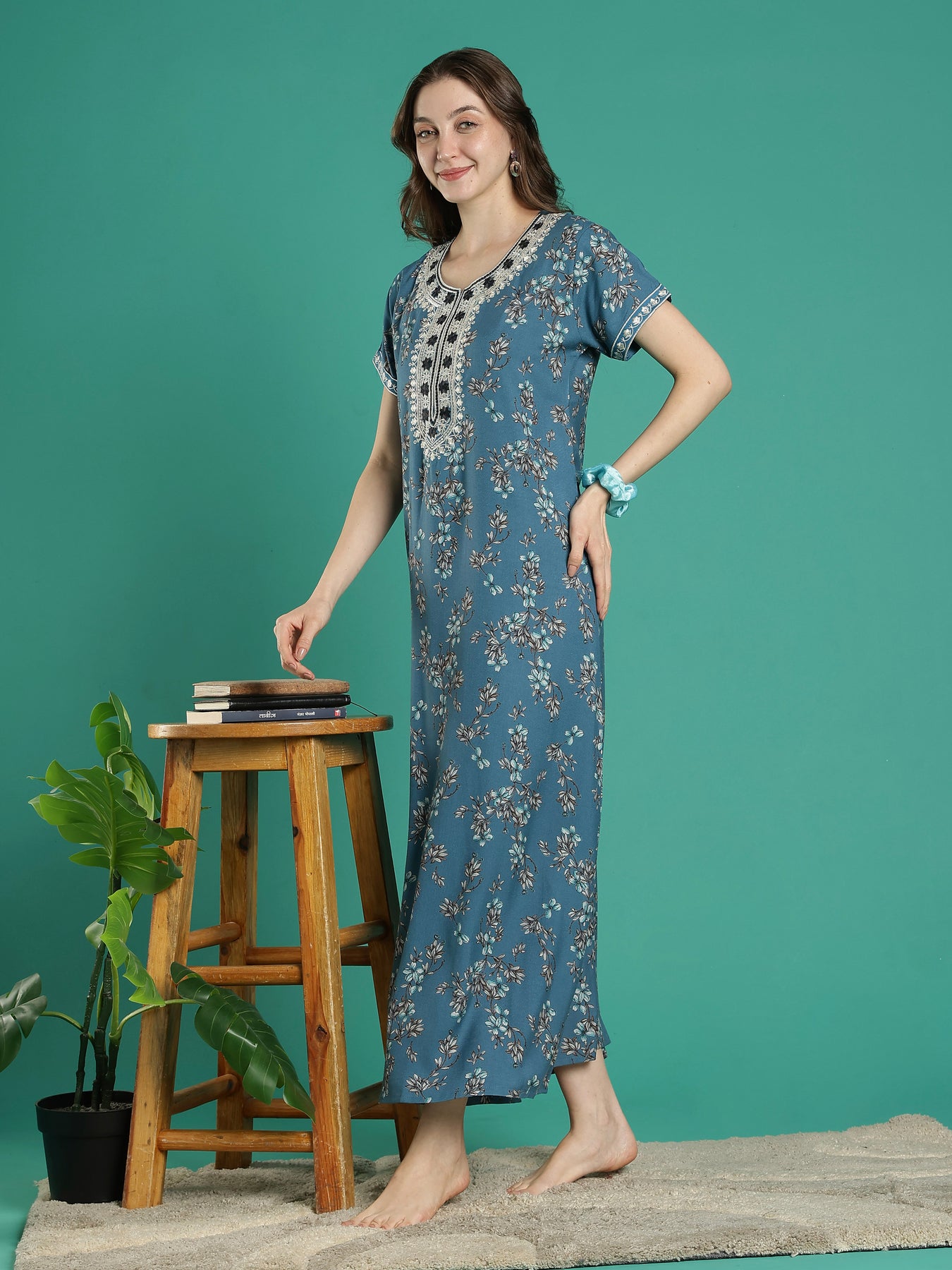 Teal Floral Alpine Nighty for Women Breathable A Line Fit
