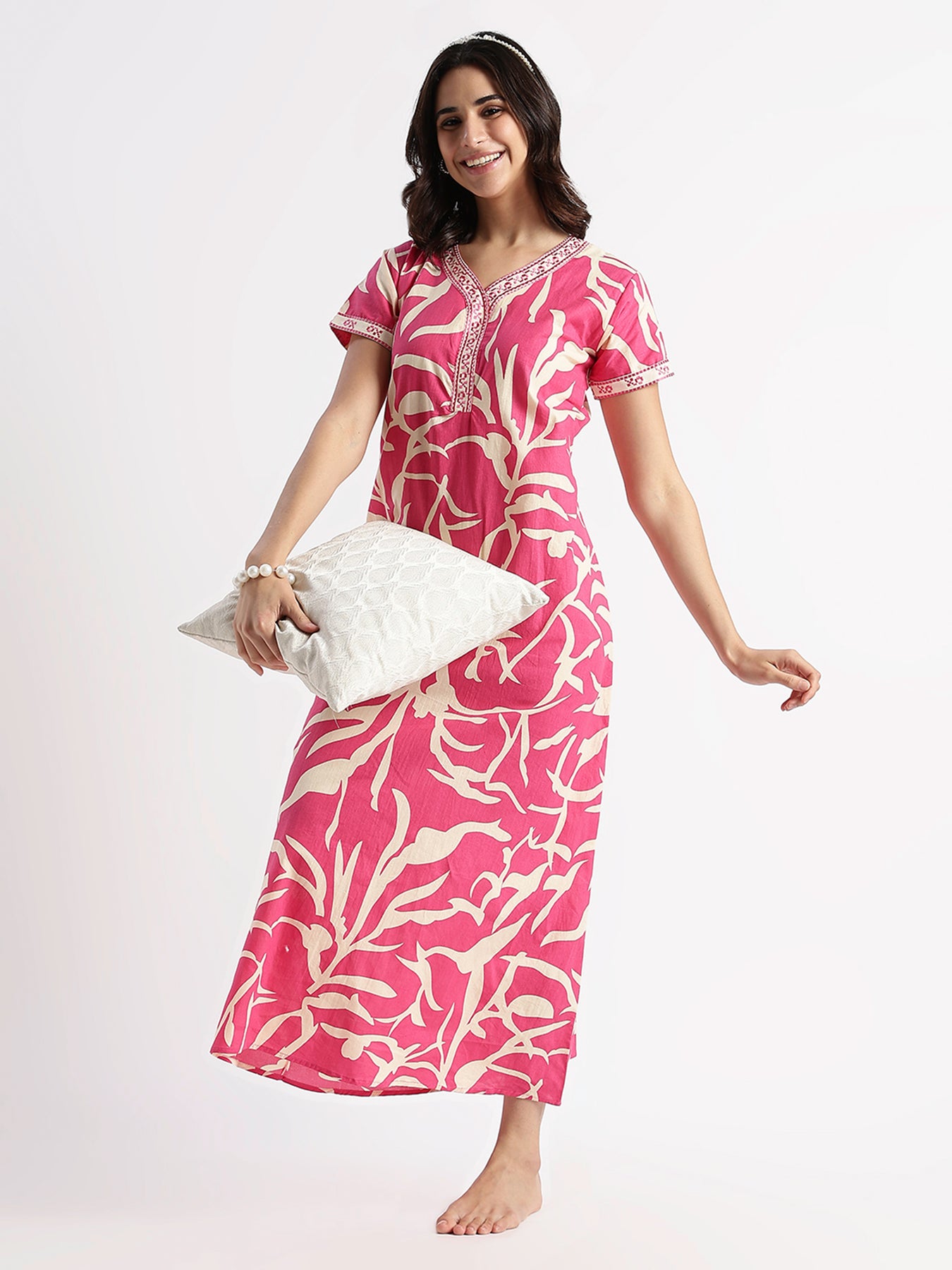 Pure Cotton Leaf Print Designer Nighty for Women Flamingo Bloom