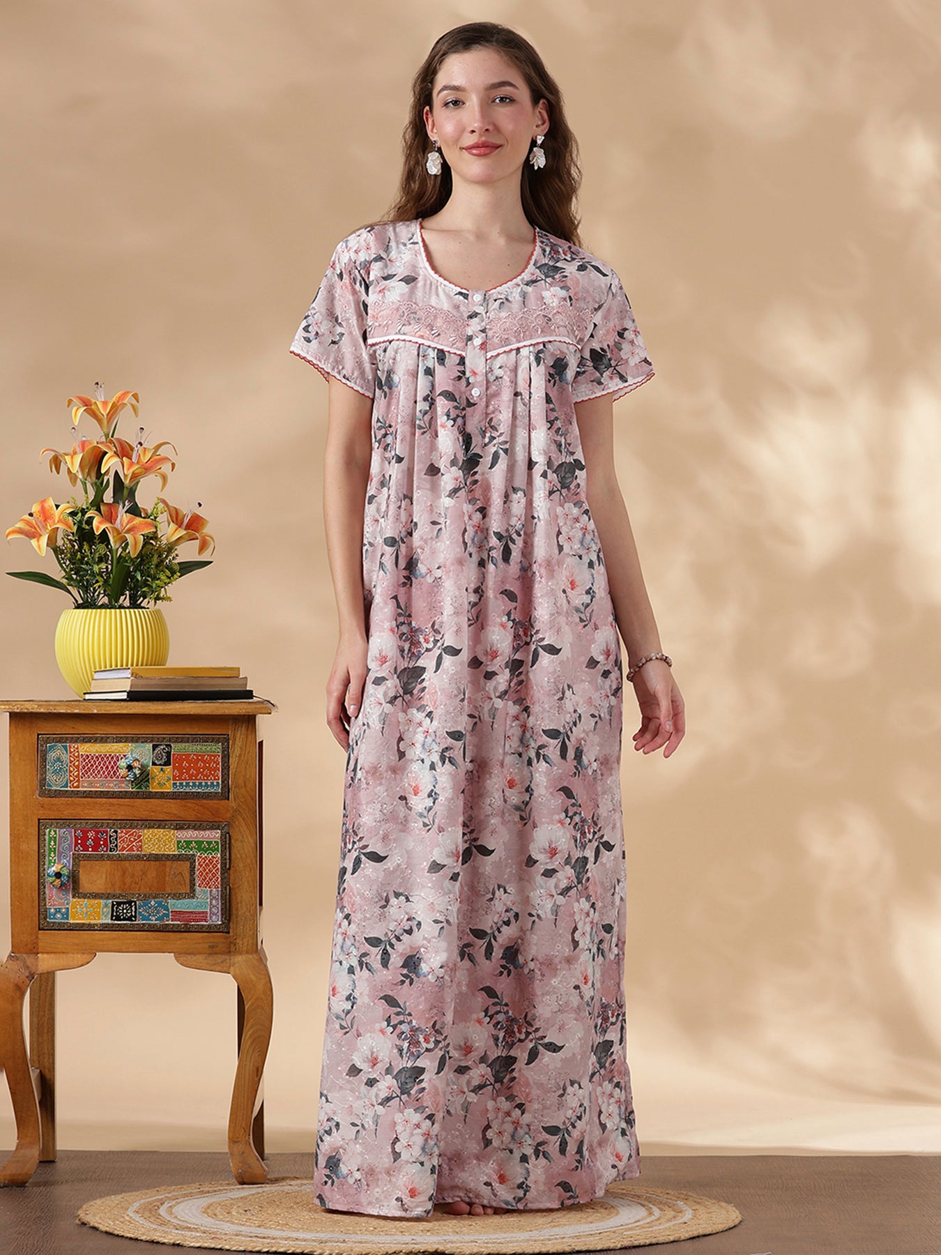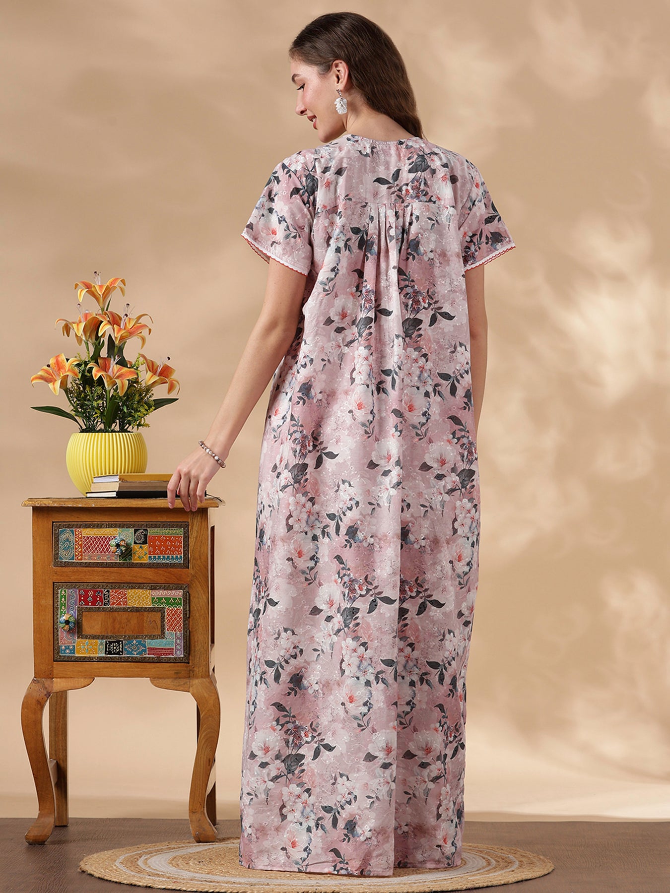 This pastel floral cotton nighty combines delicate Chikankari embroidery with everyday comfort. The soft dusky pink, grey, and white blossom print creates a calming, feminine look. The square yoke features fine embroidery paired with lace accents for handcrafted elegance.