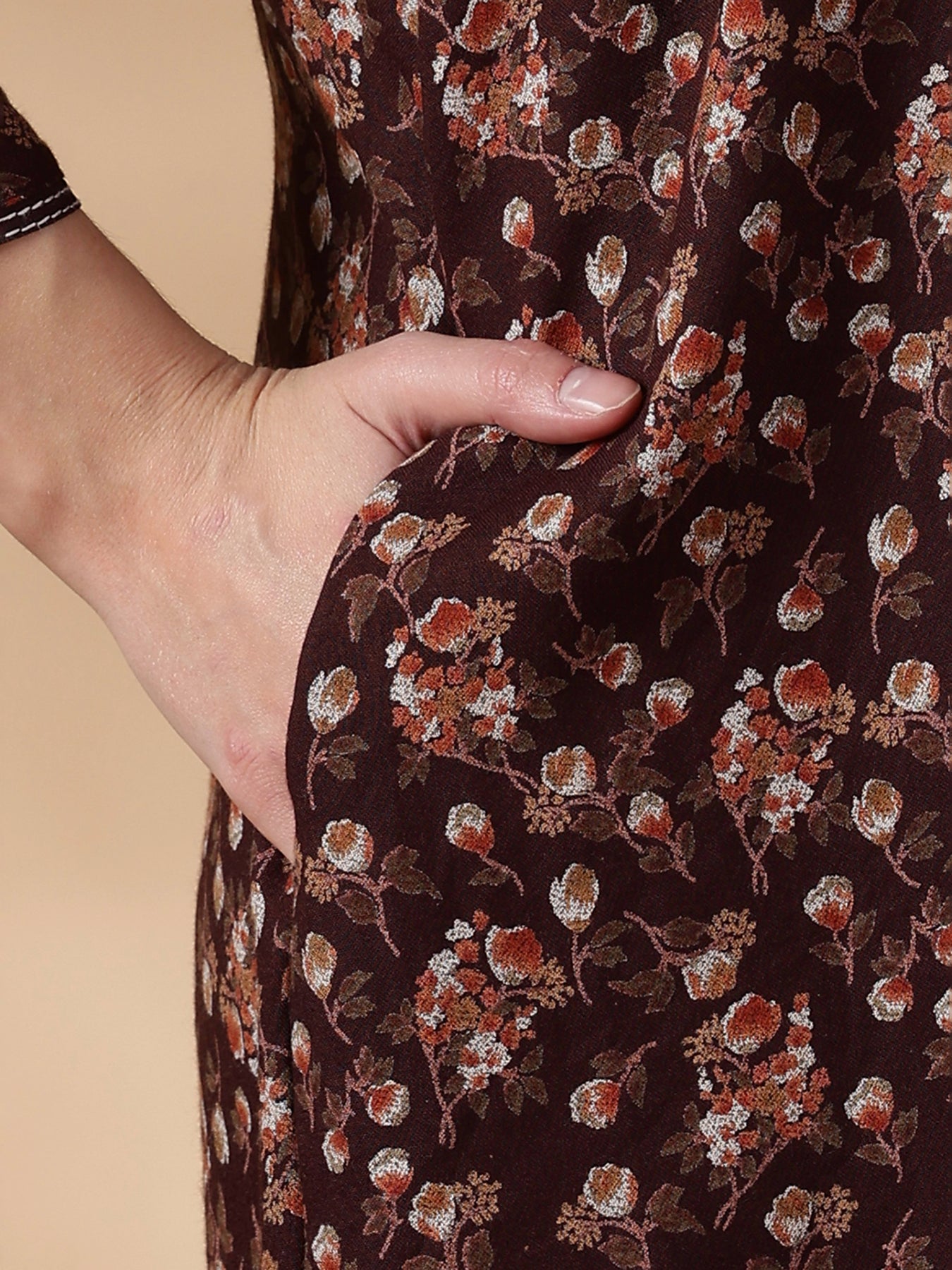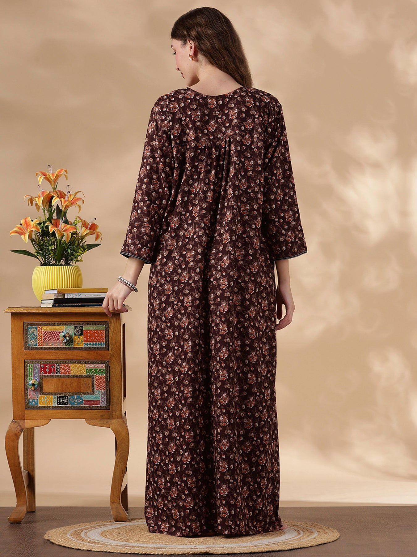 Enjoy the soothing touch of alpine fabric paired with warm floral tones that add charm to your nightwear collection. This designer nighty features an embroidered floral neckline, soft pleats, and a flattering full-length flow. The orange-brown palette brings an earthy elegance to your evening routine, making it a beautiful choice in nighties for women who love comfort and style.