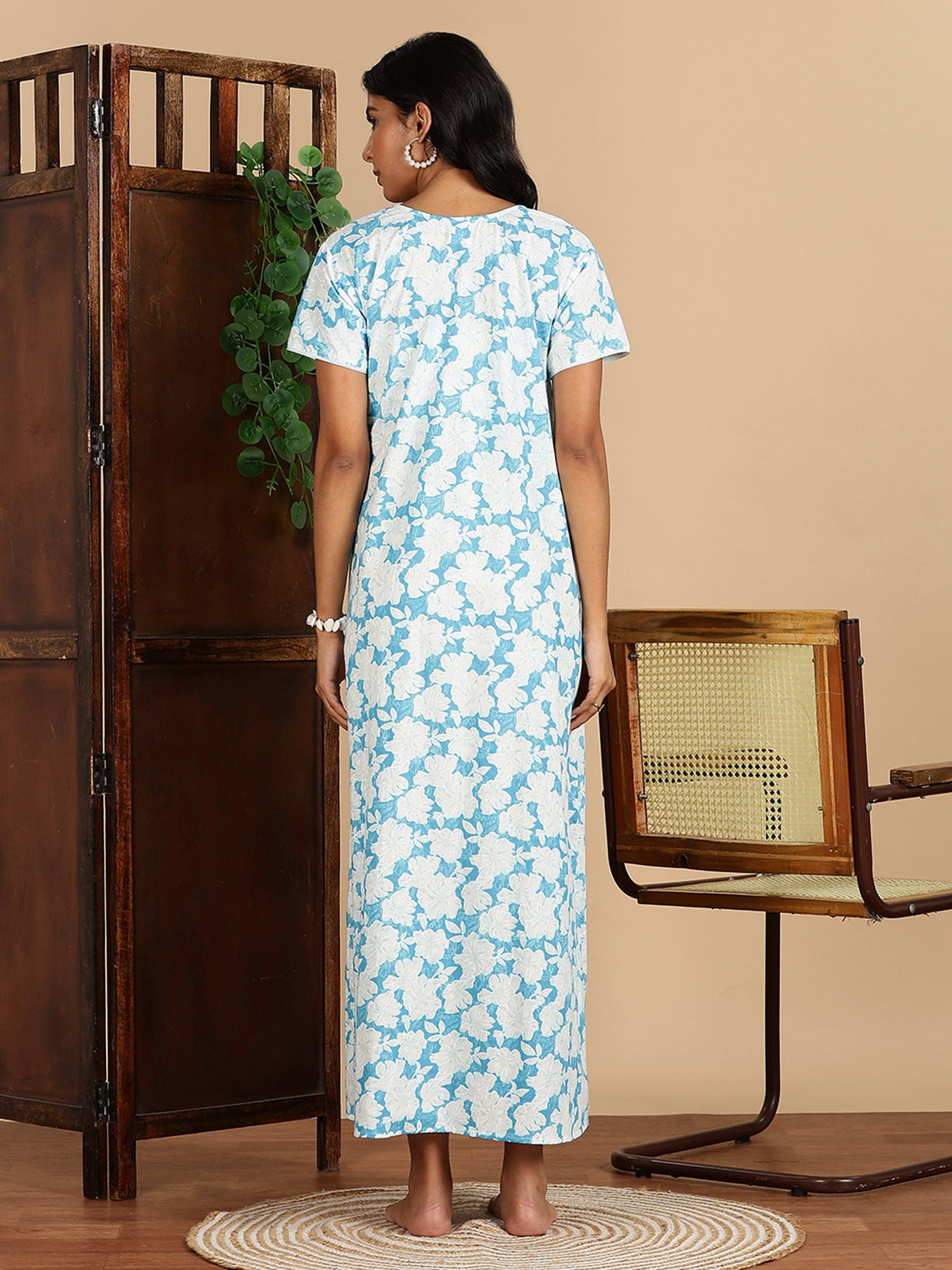 Ocean Breeze Pure Cotton Maxi Nighty with Floral Detailing