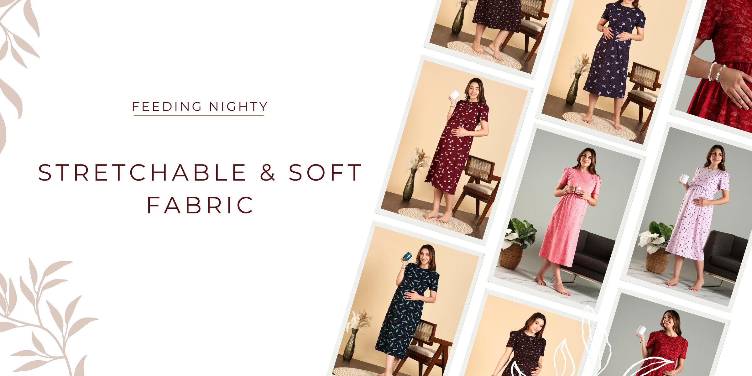 Experience soothing softness and effortless nursing with this floral maternity nighty crafted from premium hosiery cotton. Designed with a zipless overlap front, it ensures feeding comfort without any zippers or irritation. The adjustable tie-back belt, puff sleeves, and side pocket make it both stylish and functional, perfect for cozy nights and peaceful mornings.