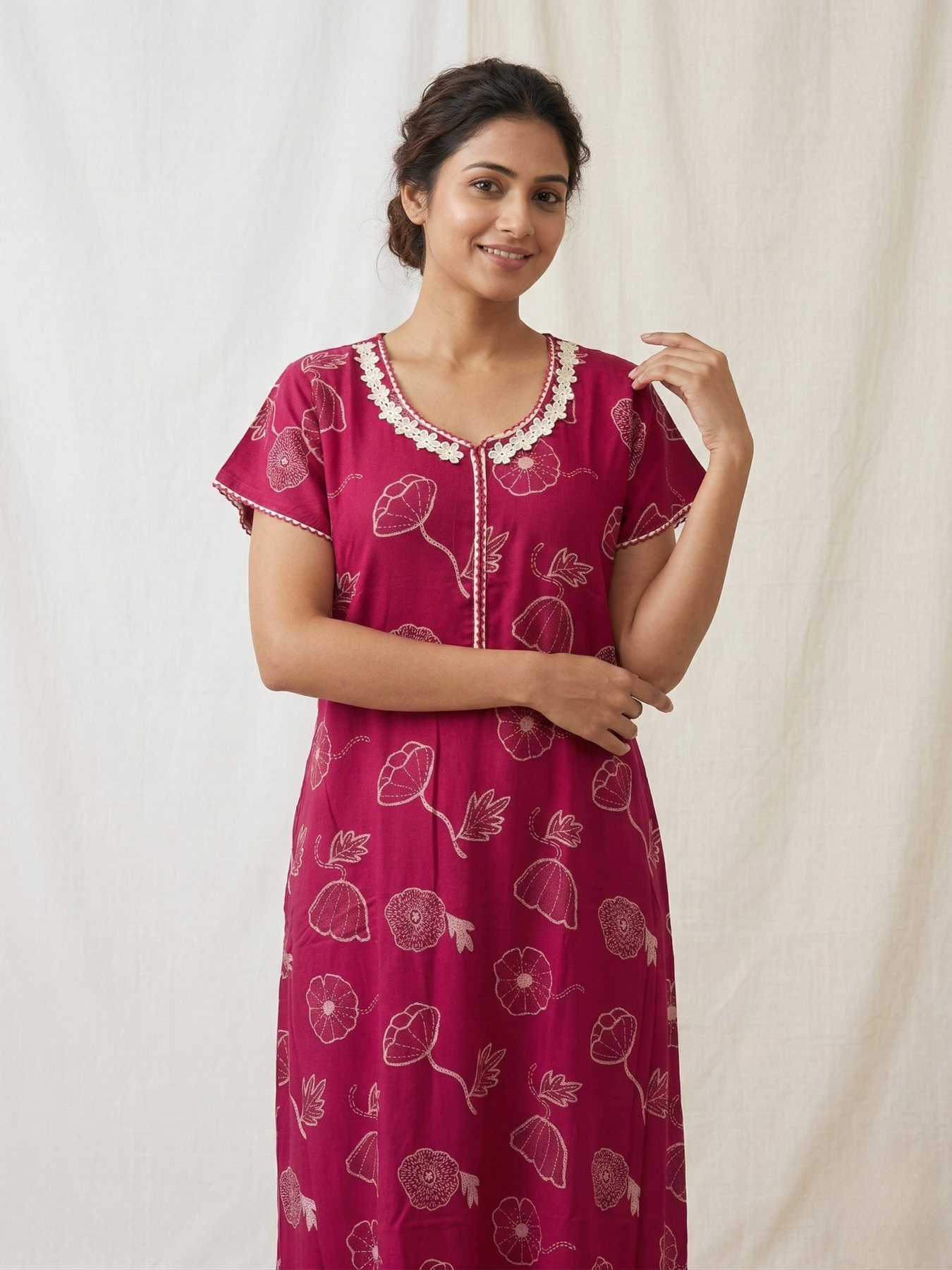 The Daisy Pink Alpine Designer Nighty is designed for women who love soft hues and elegant floral prints. Featuring a flowy A-line silhouette, lace-trimmed neckline, and functional front zip, this breathable night dress for women offers both comfort and effortless charm.
