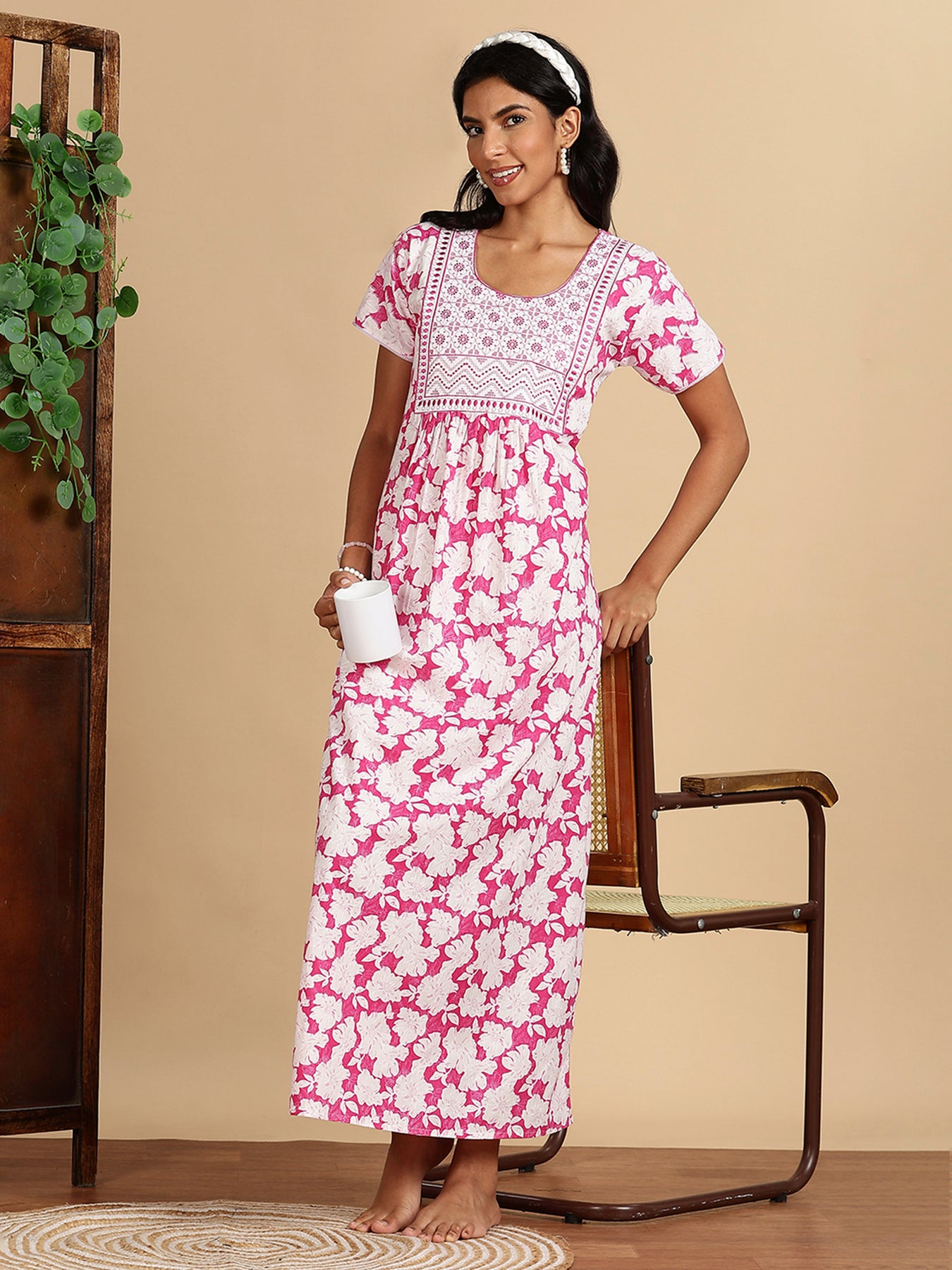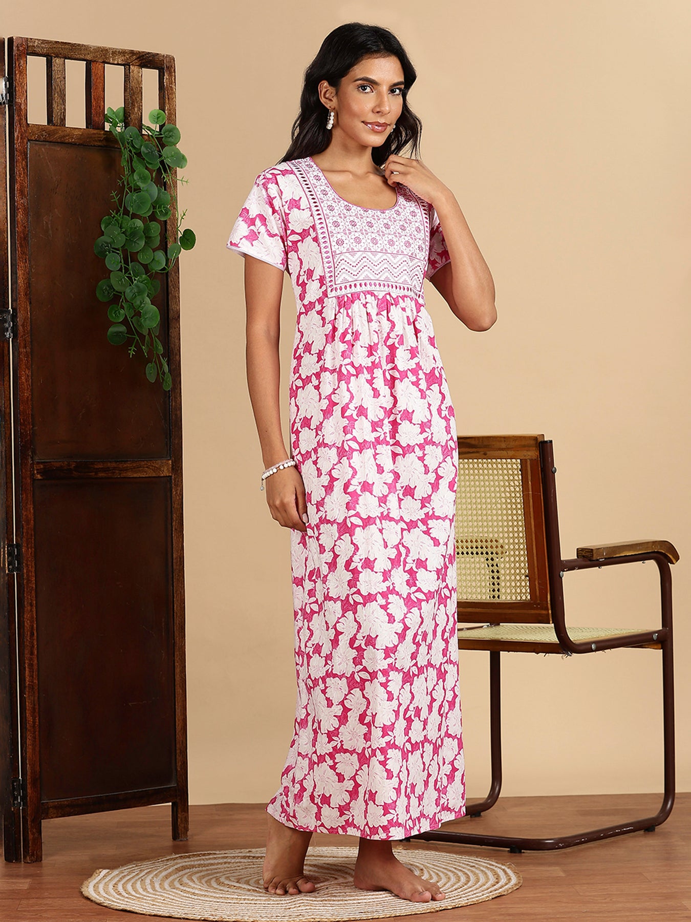 Add freshness to your loungewear with the Flamingo Pink Pure Cotton Jaipuri Nighty. The charming shade, embroidered yoke, A-line fit, and handy pocket create a blend of elegance and practicality. Crafted in breathable cotton, it’s perfect for women who love colorful comfort in their cotton nightgowns for women collection. A timeless choice for relaxed evenings and peaceful nights.