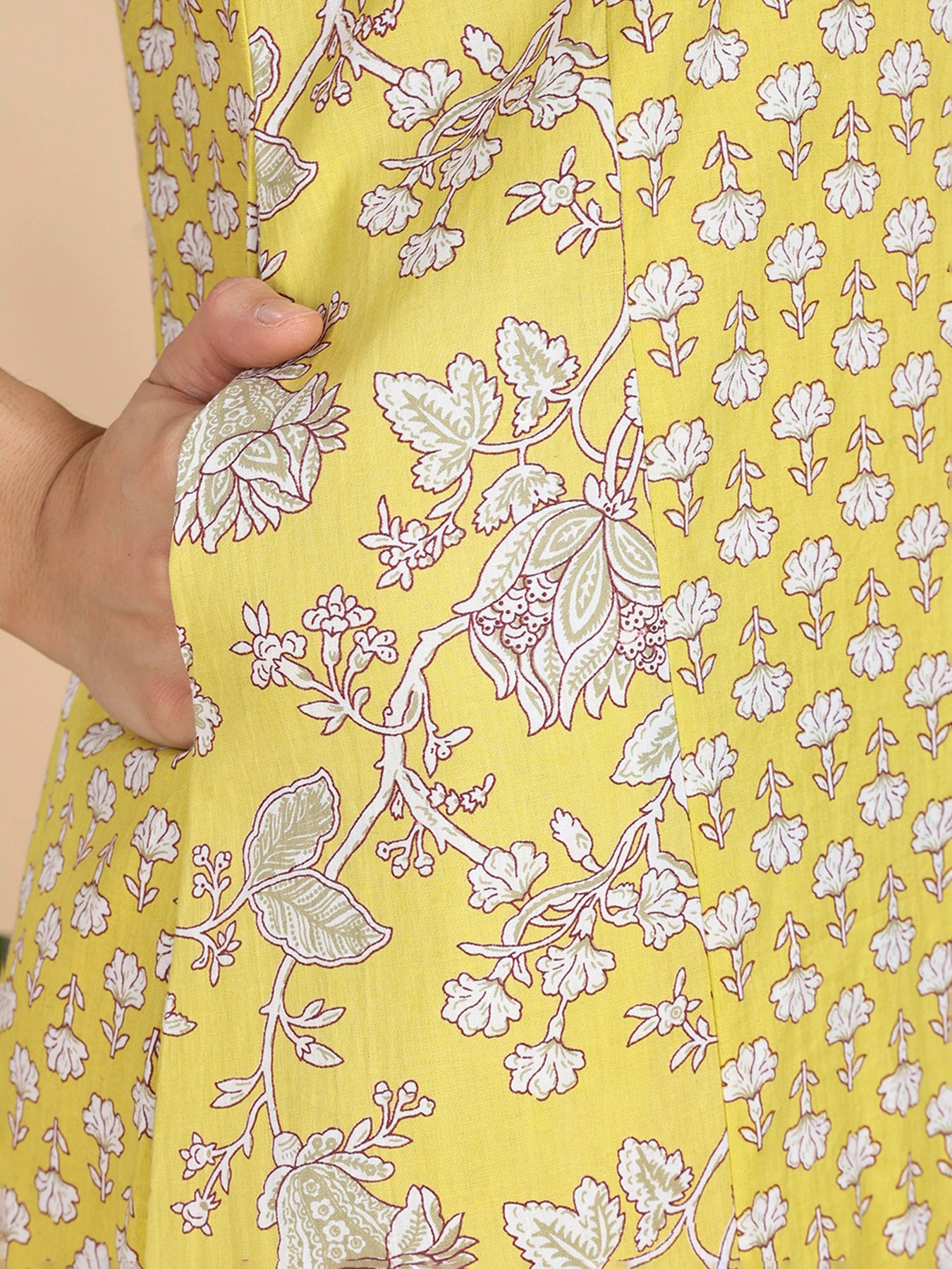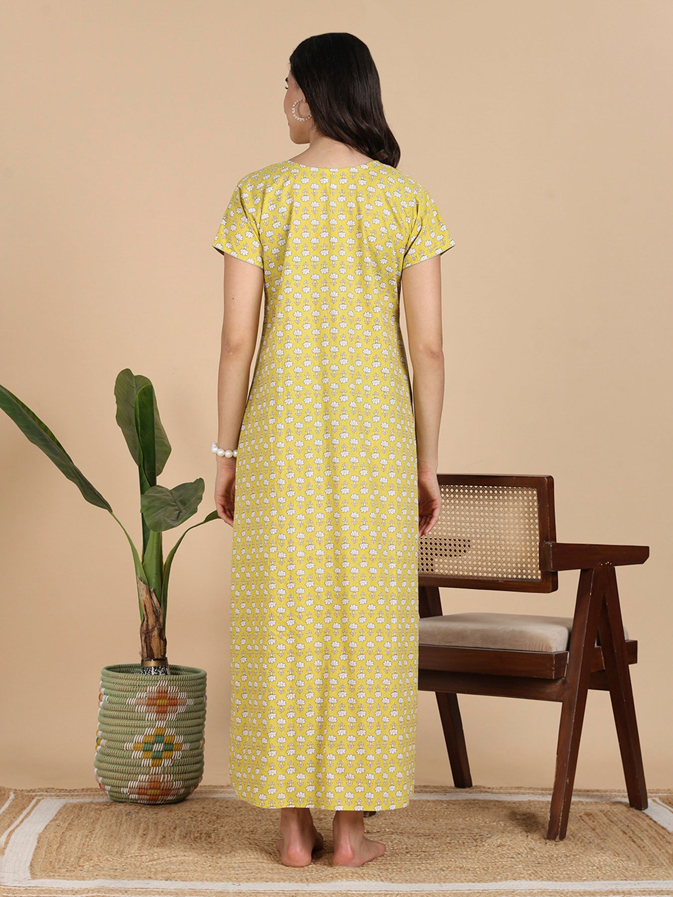 Mustard Yellow Jaipuri Cotton Nighty with Side Panels and Pocket