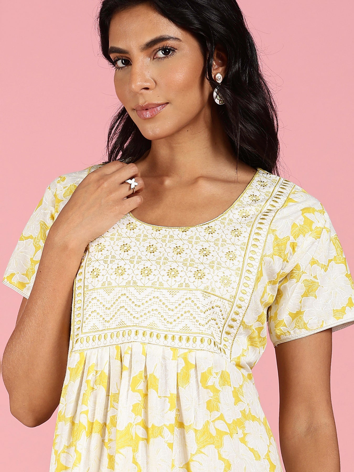 Pollen Yellow Pure Cotton Jaipuri Nighty with Embroidered Yoke
