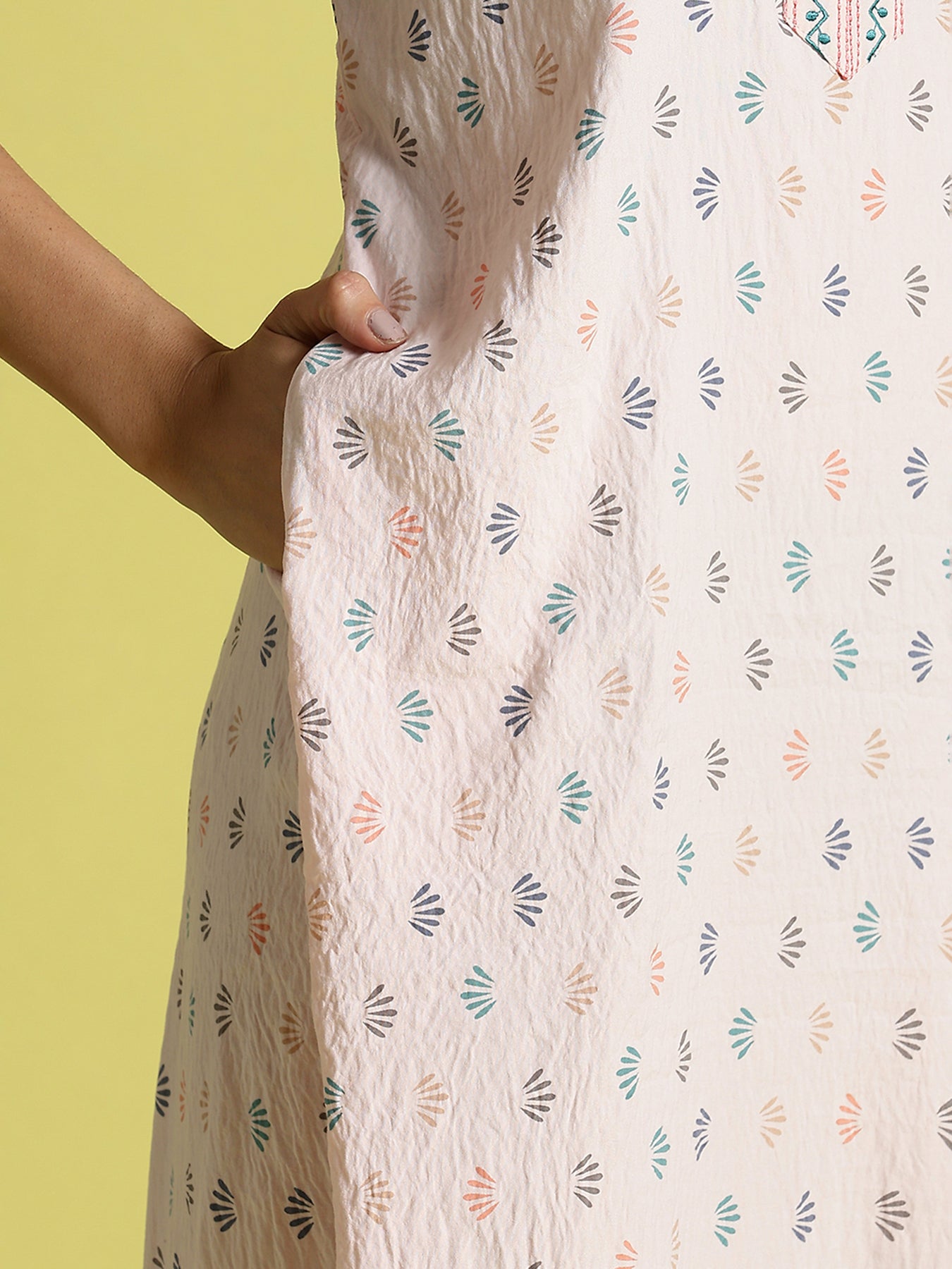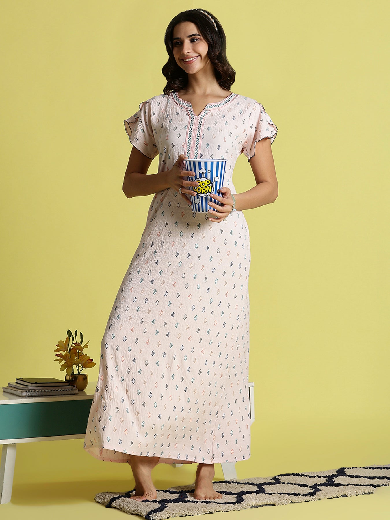 Relax in effortless style with this Sky Pastel Pink nighty for women. Featuring multicolor shell prints and embroidered detailing at the neckline, it brings a fresh, calming vibe to your nightwear collection.