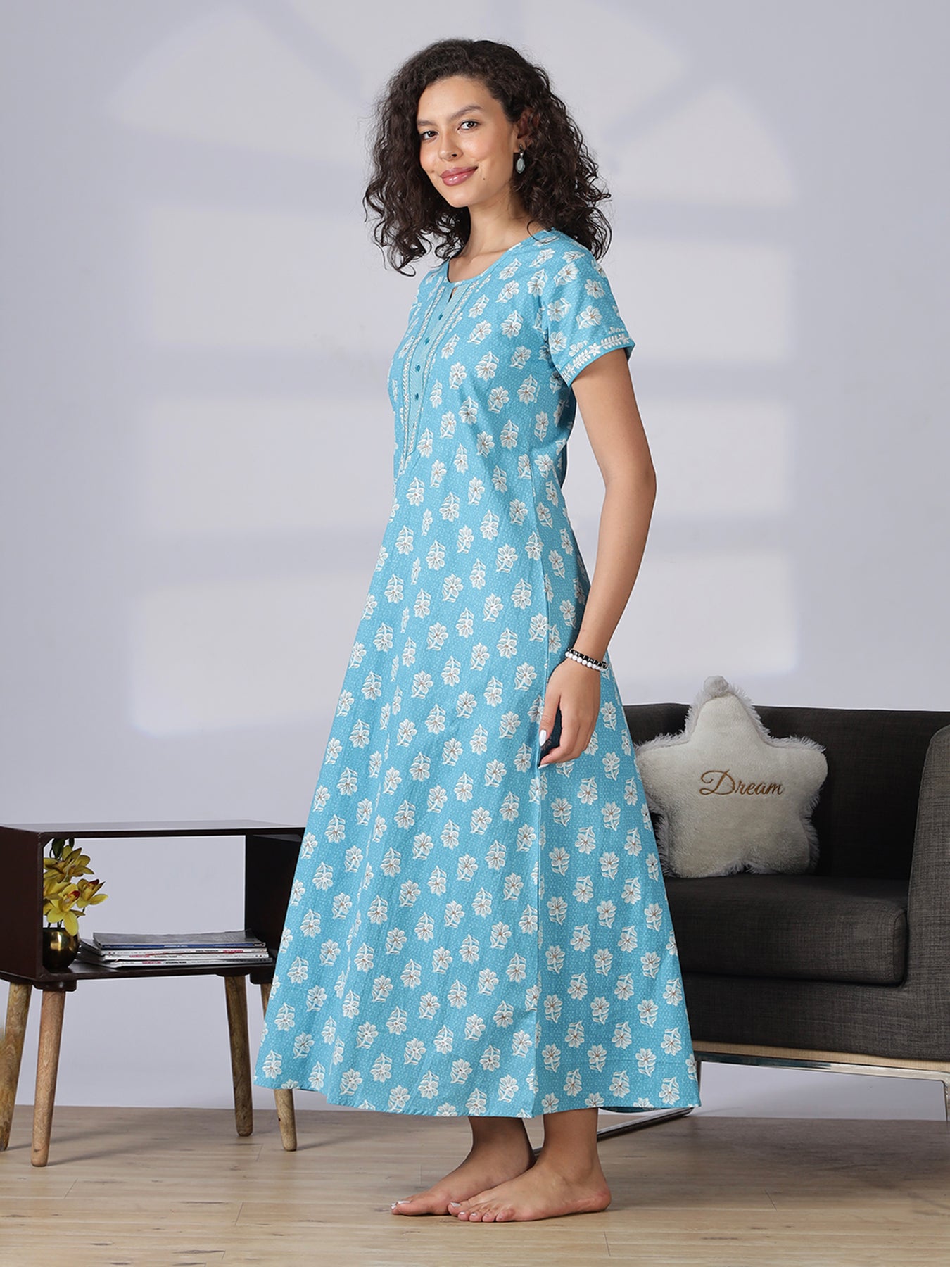 The vintage floral print on a soothing aqua base creates a calm and pleasant look. The relaxed A-line silhouette offers ease of movement and a flattering fit, making it suitable for sleeping, lounging, and daily home wear.