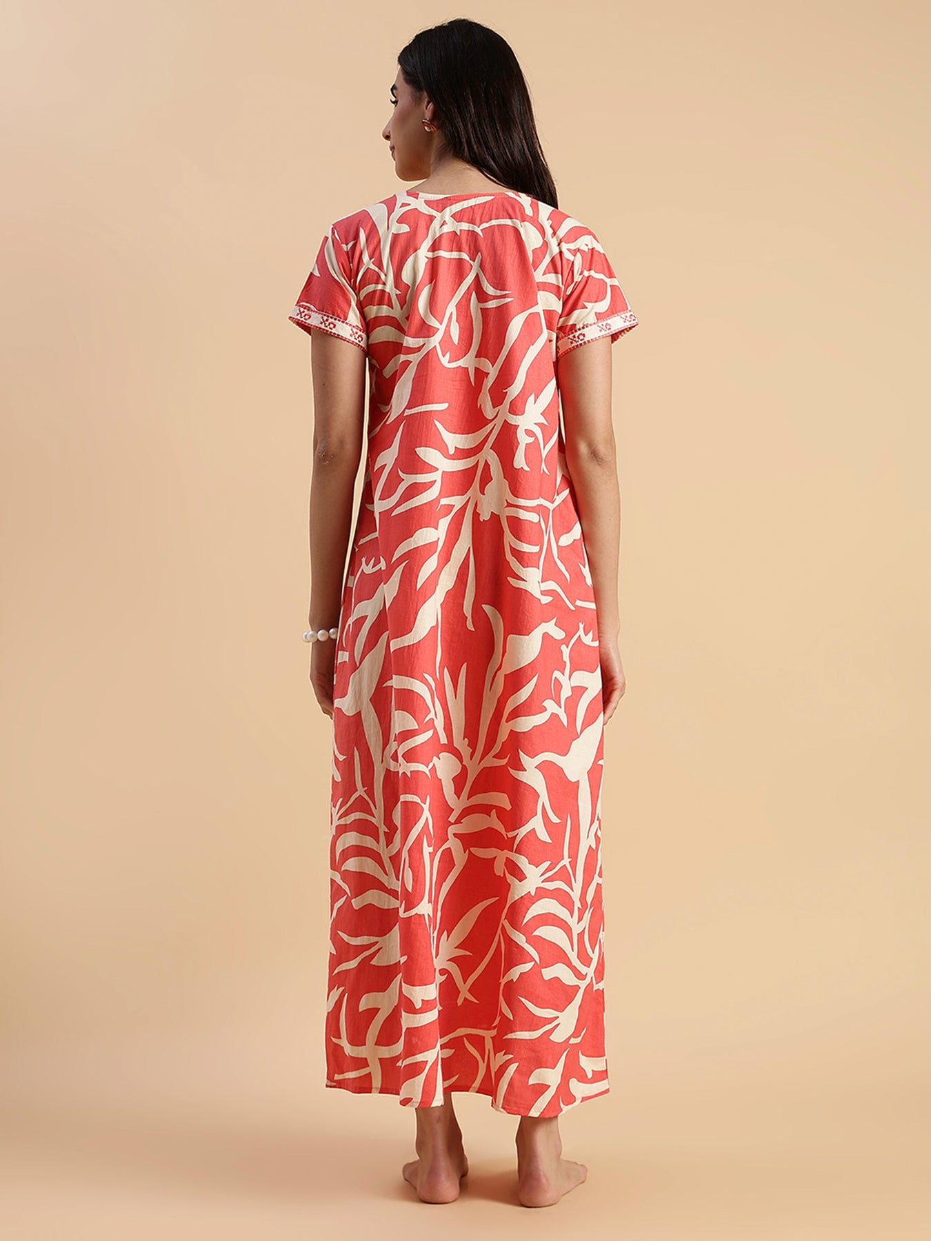 Inspired by the warm glow of evening skies, the Sunset Ember Pure Cotton Nighty blends style and comfort beautifully. The rich coral tone paired with a bold leaf pattern makes this night dress perfect for women who enjoy vibrant yet graceful nightwear.