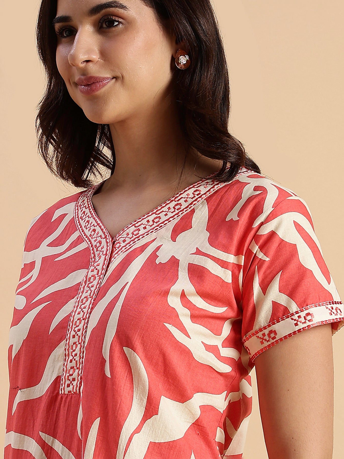Warm Coral Leaf Print: A striking, stylish look for everyday wear