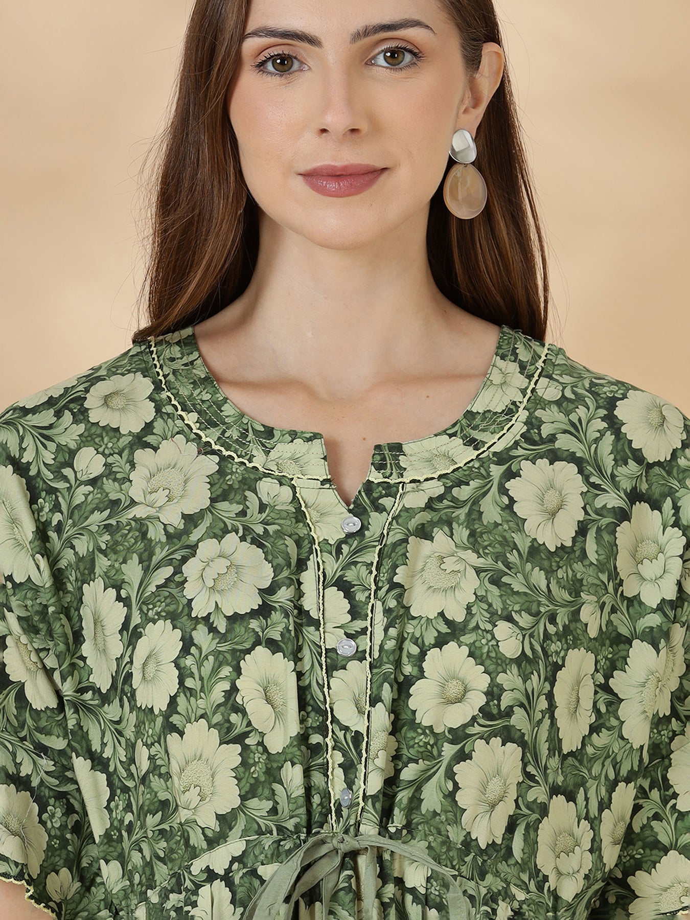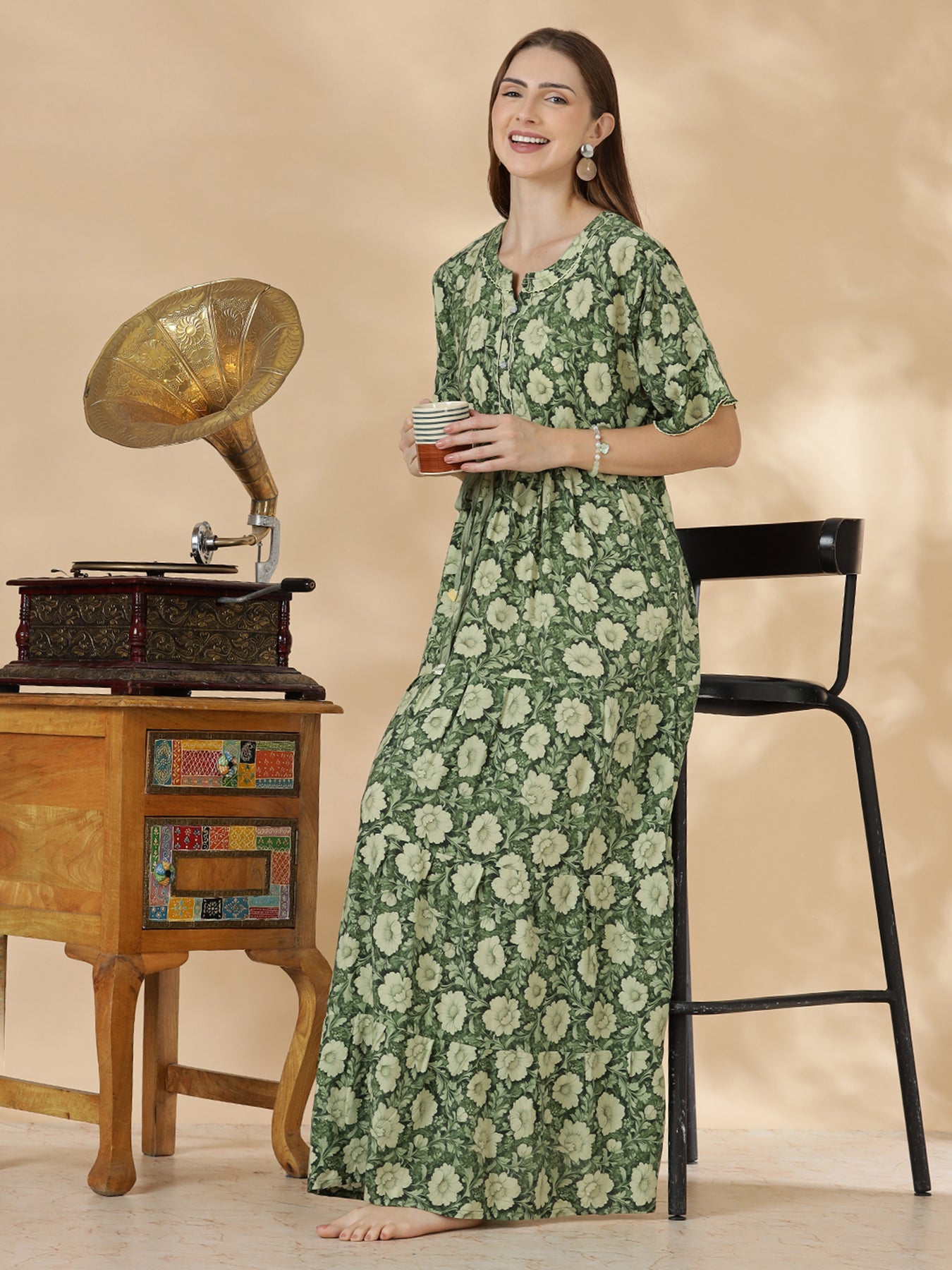 Bring home this rayon botanical night dress and enjoy relaxed evenings wrapped in softness. Shop now for a flowy nighty designed for effortless comfort and style.