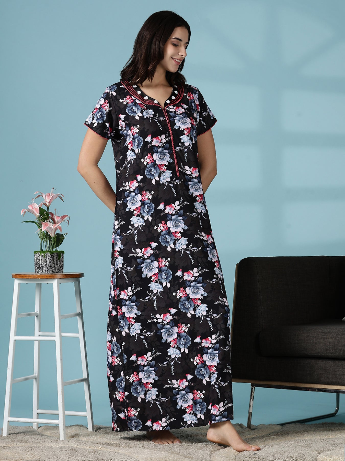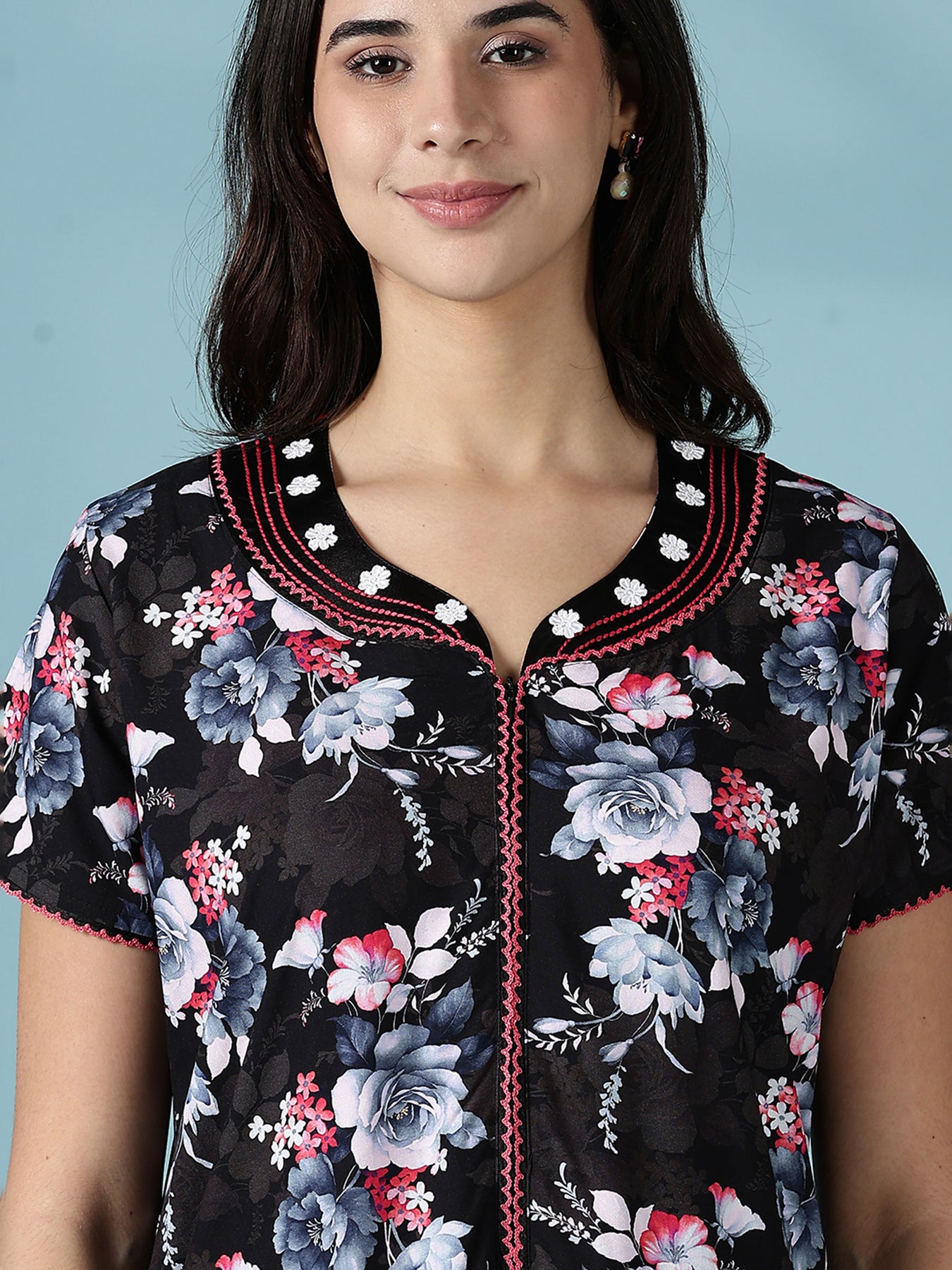 Experience unmatched comfort with this Rayon Floral Nighty in Multi Black, crafted with a beautiful drape, breathable feel, and striking contrast detailing. Perfect for women who love a blend of luxury and relaxed nightwear.