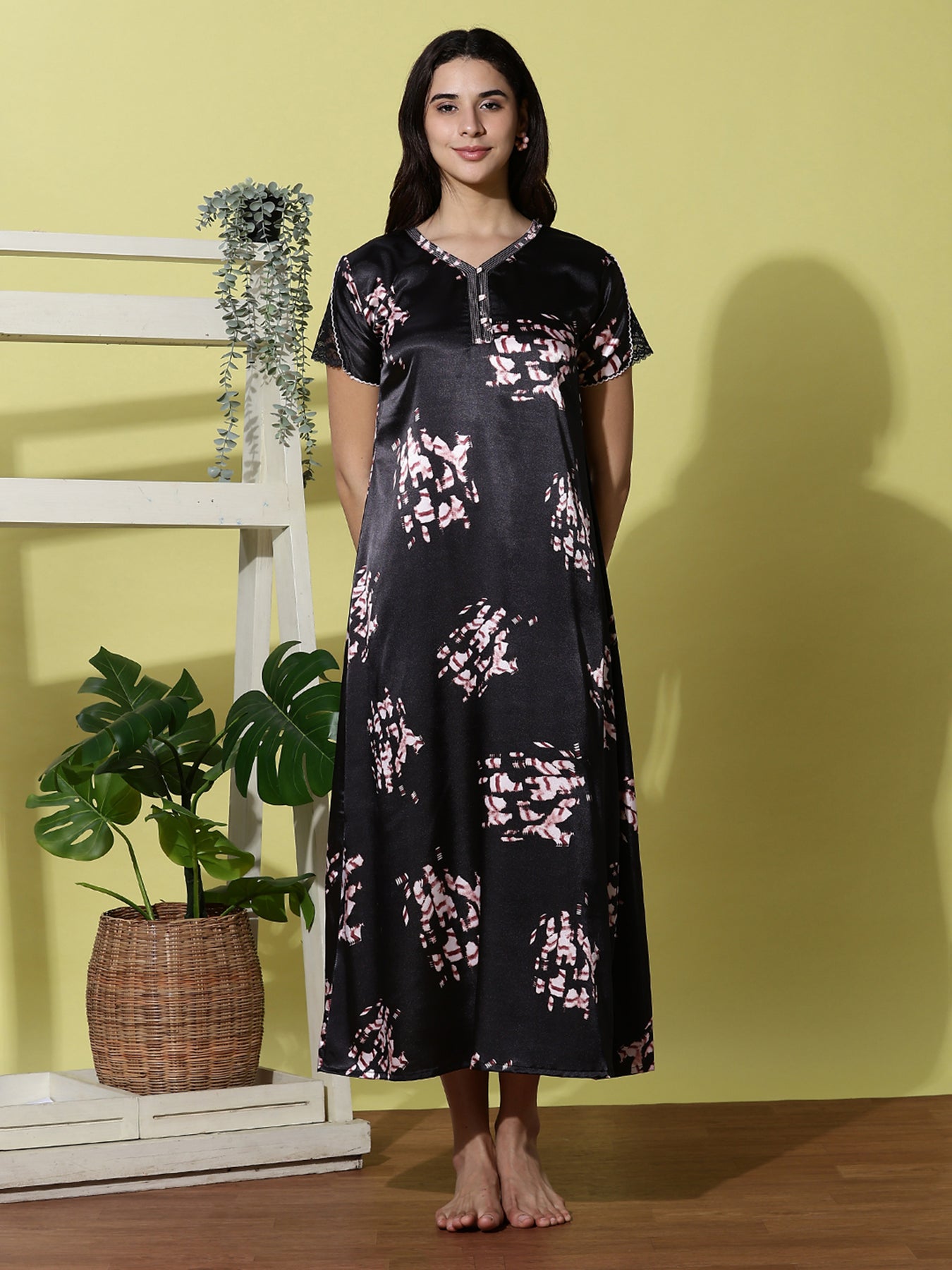 Smoke Black Velour Satin Nightdress for Women Soft and Stylish