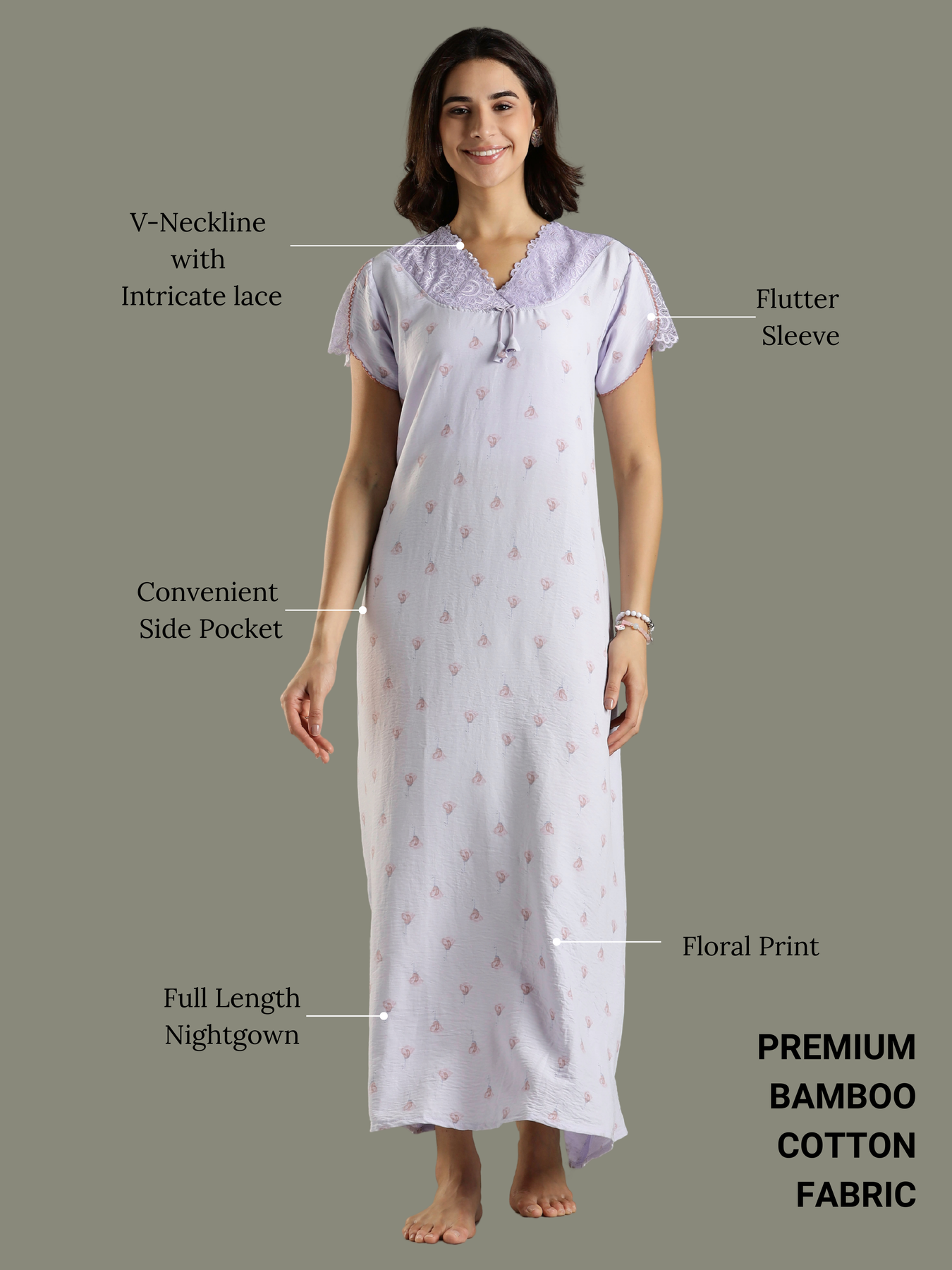 Light Purple Bamboo Cotton Lace Design Nighty for Women