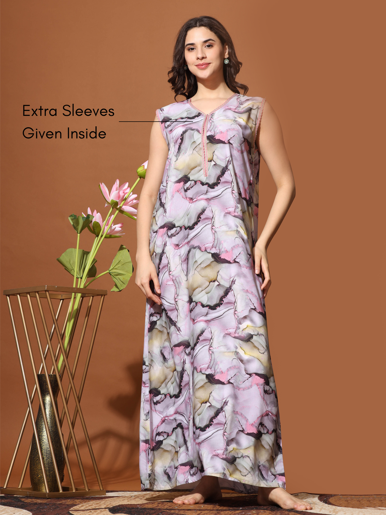 Features: This sleeveless nighty includes a convenient pocket on the right side and a front zipper for easy wear. For added versatility, extra sleeves are provided, which can be attached for enhanced comfort.