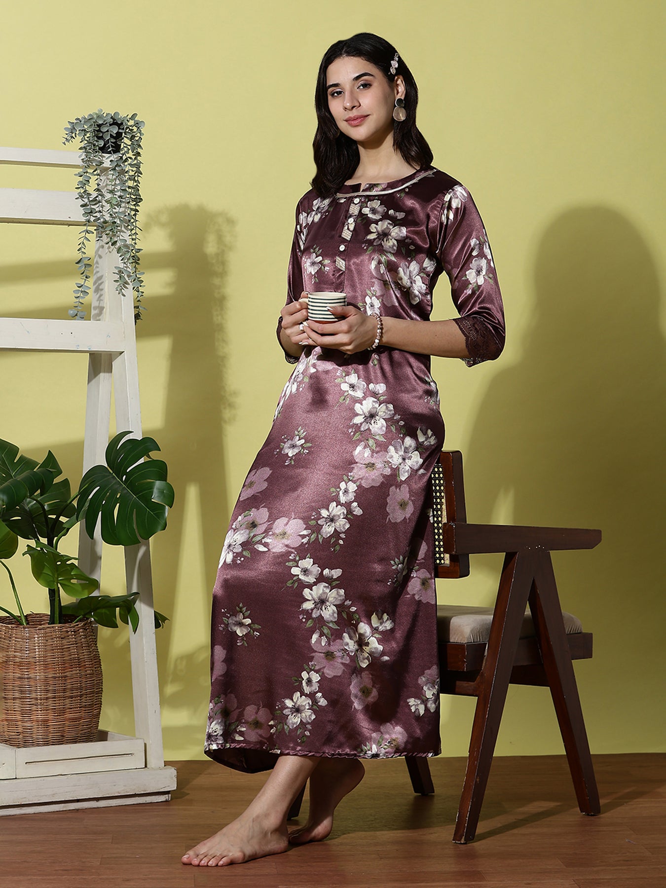 Plum Smoke Floral Satin Nightdress for Women with Lace Sleeves and Sheen Finish