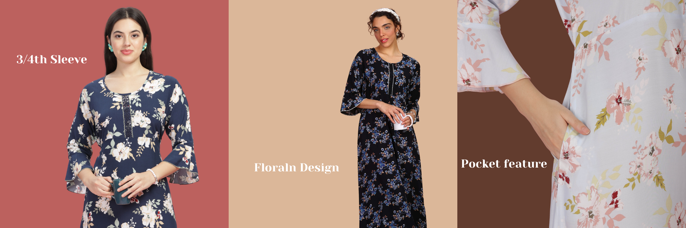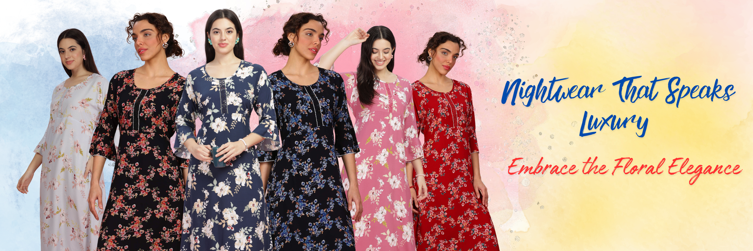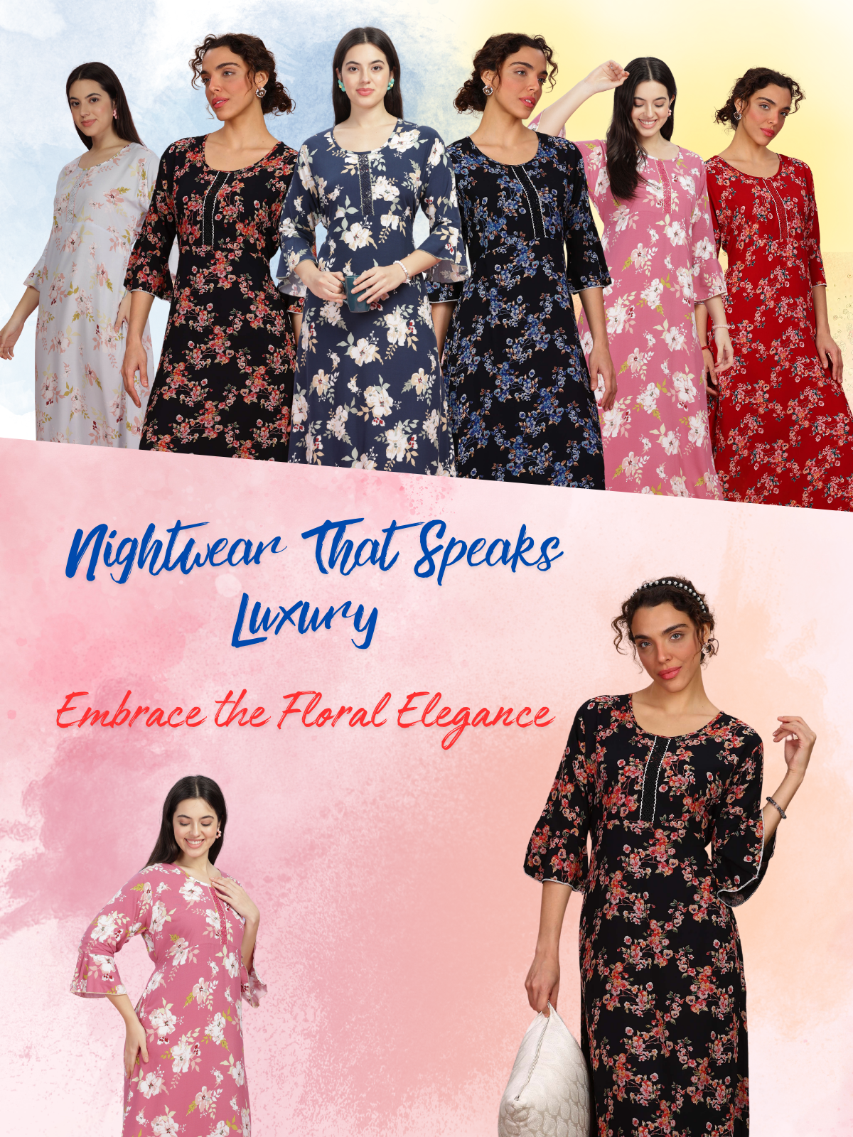 Experience effortless comfort with this premium rayon floral nighty for women designed for modern relaxation. Crafted in ultra-soft rayon fabric, this maxi-length night dress for women features a flattering A line silhouette that drapes beautifully while ensuring complete ease of movement.