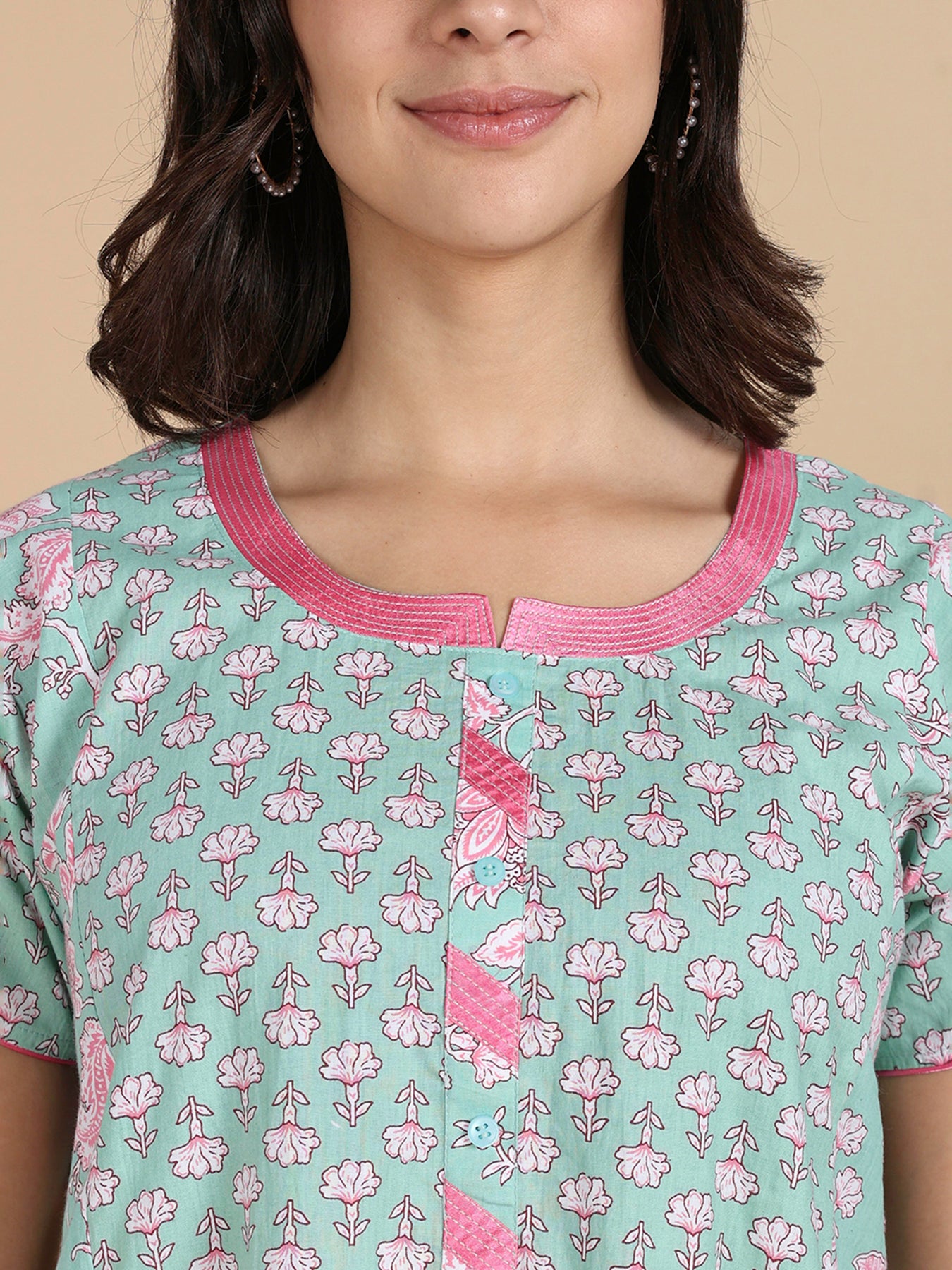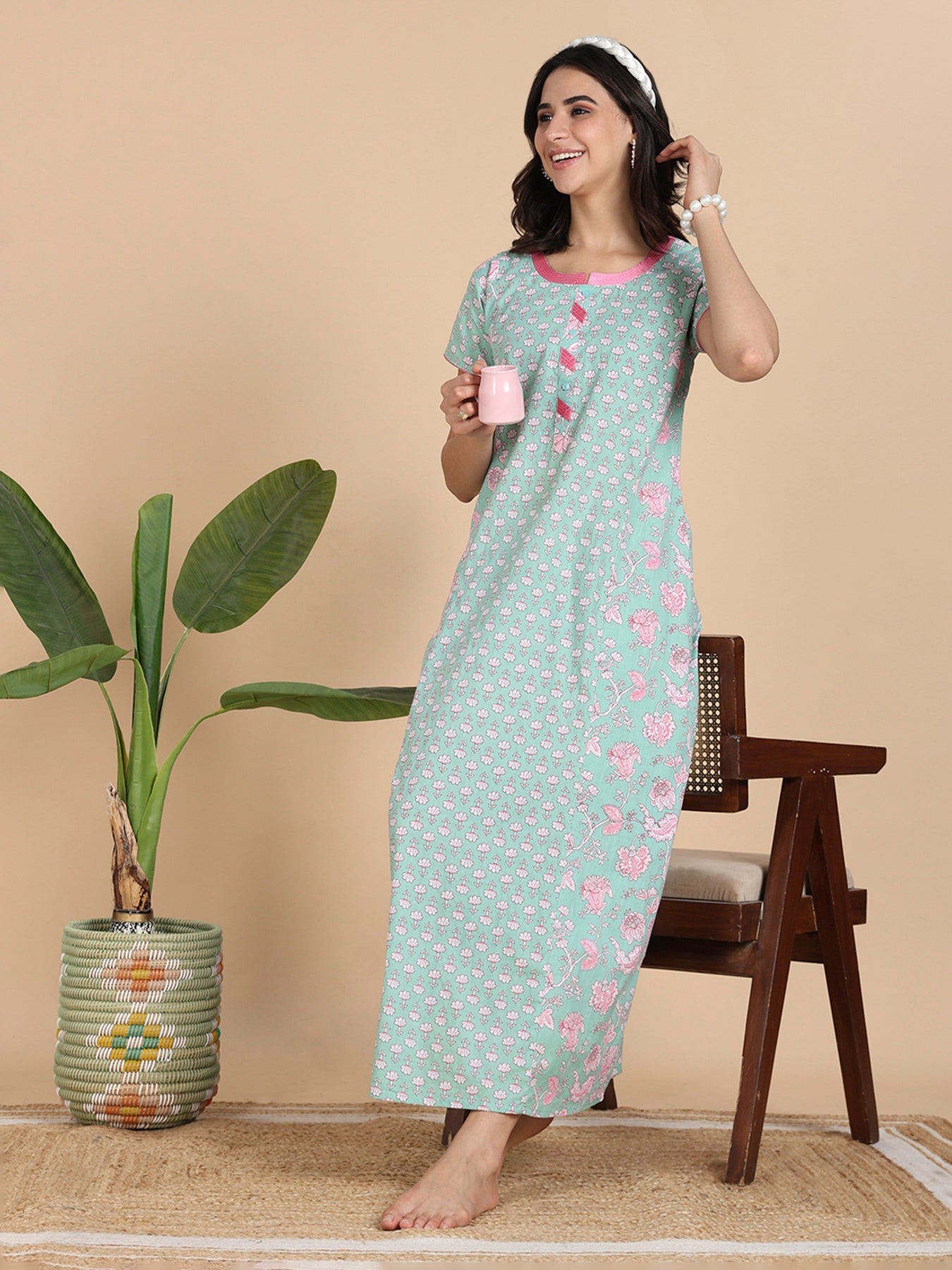Mint Green Jaipuri Pure Cotton Nighty with Floral Print and Pocket