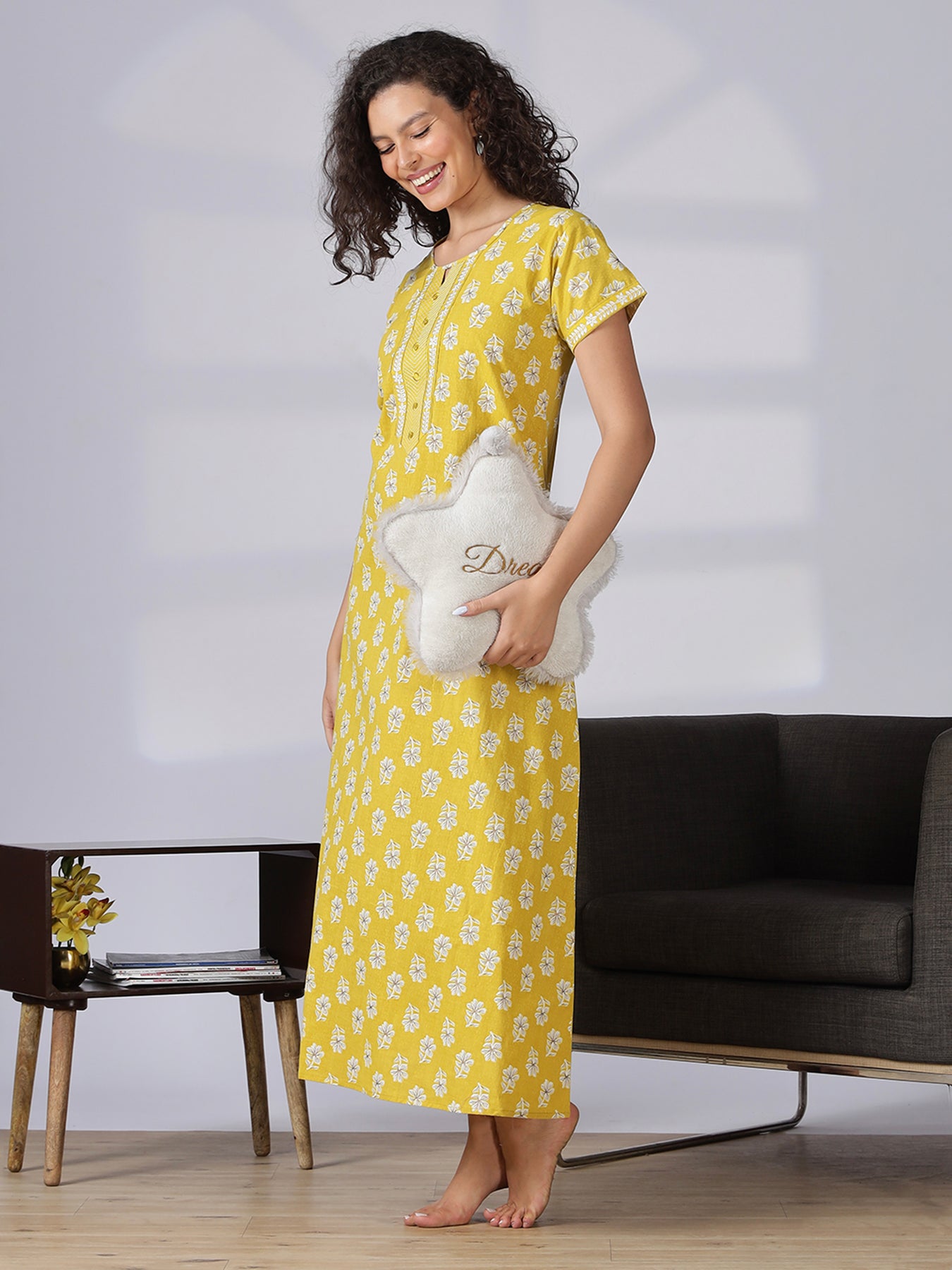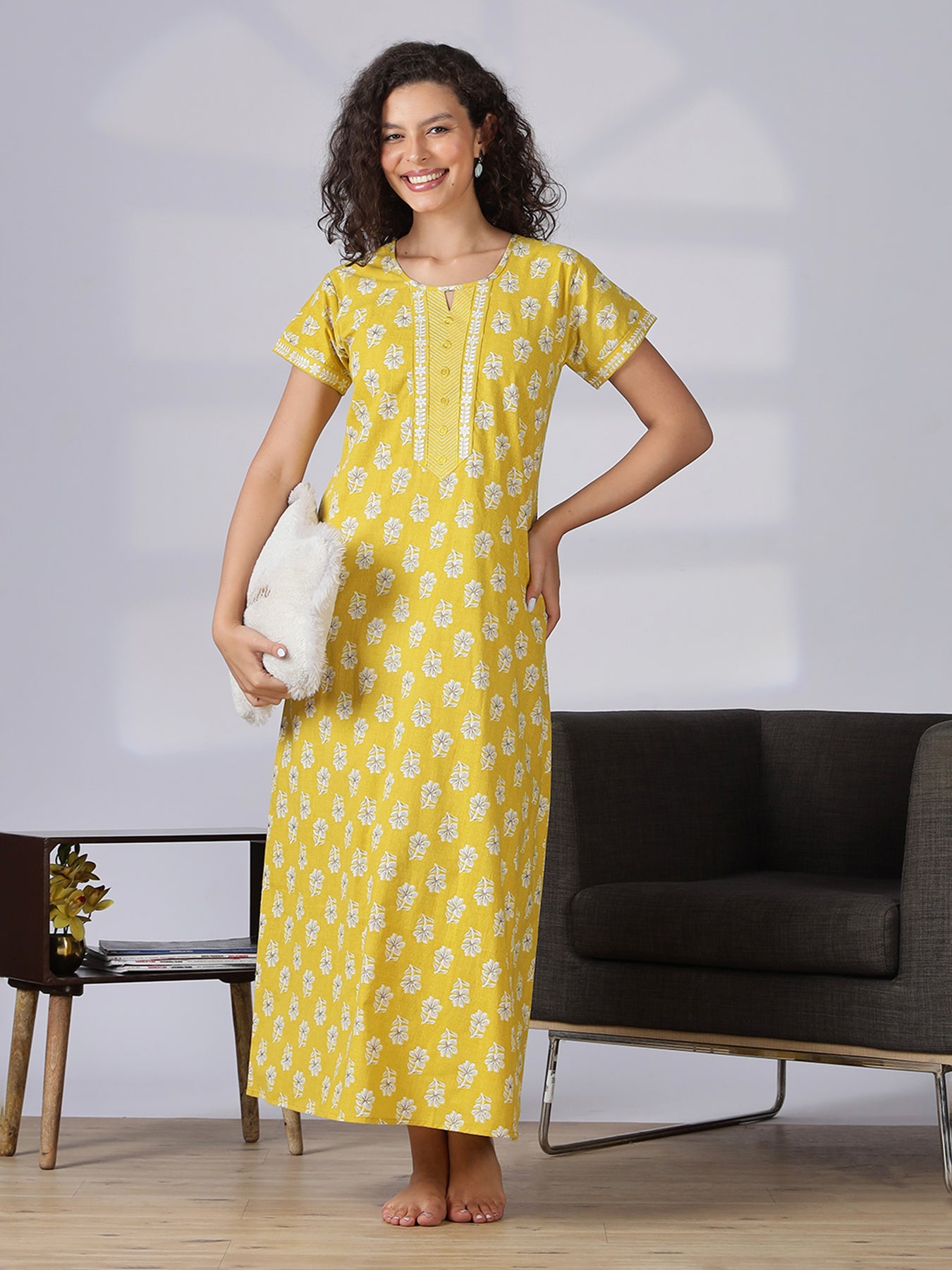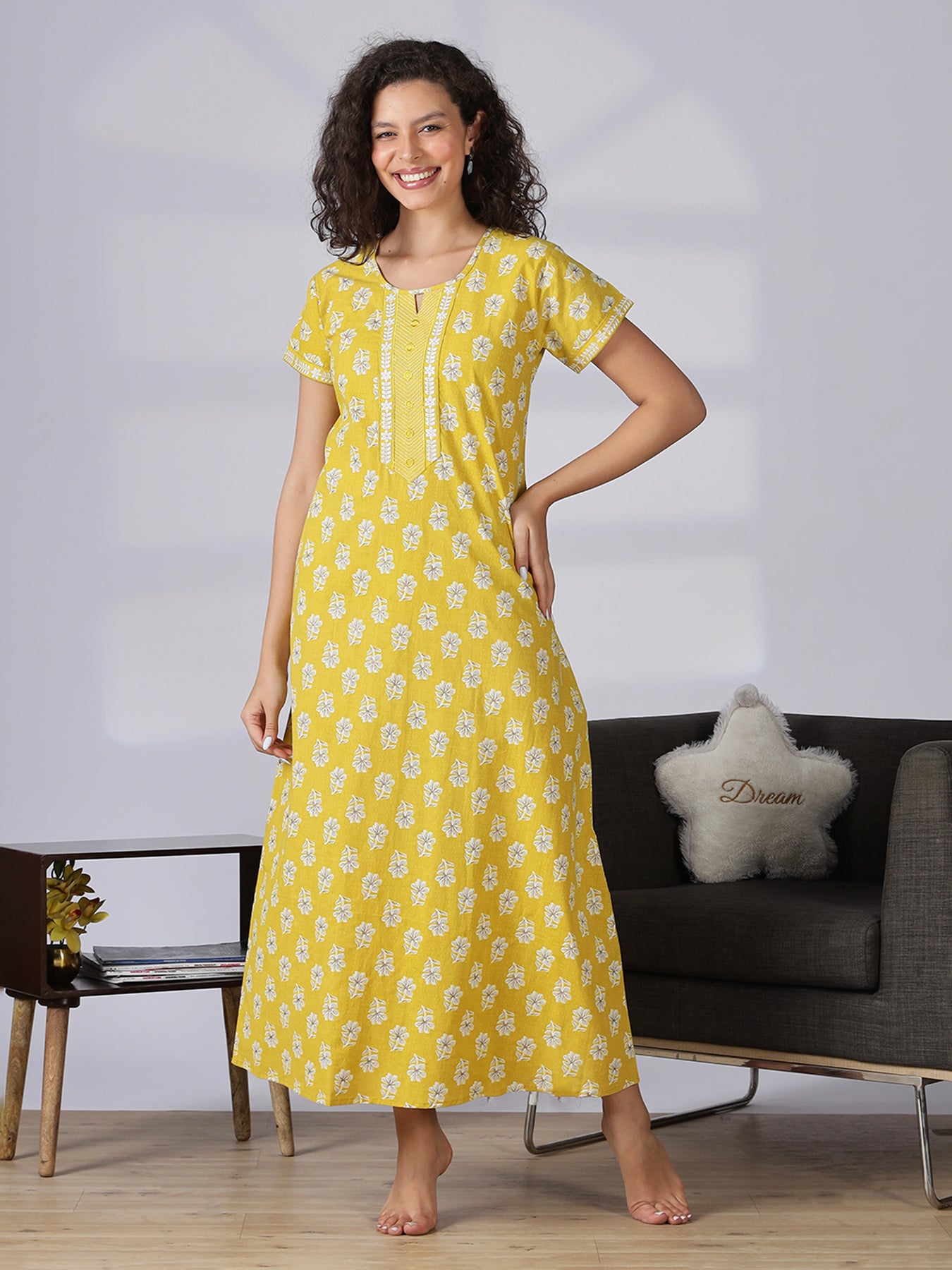 Yellow Floral Pure Cotton Nighty for Women with Relaxed Fit
